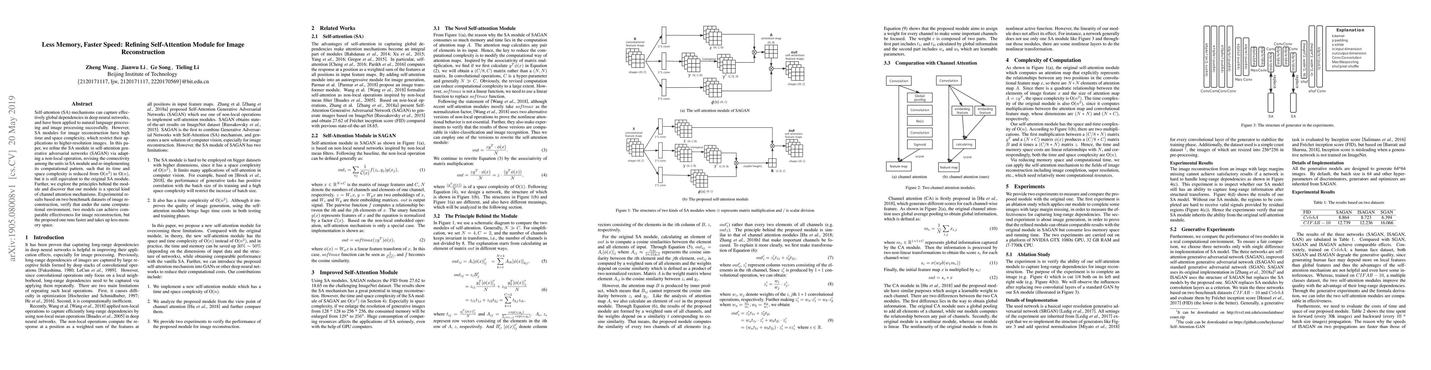 Self-attention (SA) mechanisms can capture effectively global dependencies in deep neural networks, and have been applied to natural language processing and image processing successfully. However, SA modules for image reconstruction have high time and space complexity, which restrict their applications to higher-resolution images. In this paper, we refine the SA module in self-attention generative adversarial networks (SAGAN) via adapting a non-local operation, revising the connectivity among the units in SA module and re-implementing its computational pattern, such that its time and space complexity is reduced from $\text{O}(n^2)$ to $\text{O}(n)$, but it is still equivalent to the original SA module. Further, we explore the principles behind the module and discover that our module is a special kind of channel attention mechanisms. Experimental results based on two benchmark datasets of image reconstruction, verify that under the same computational environment, two models can achieve comparable effectiveness for image reconstruction, but the proposed one runs faster and takes up less memory space.