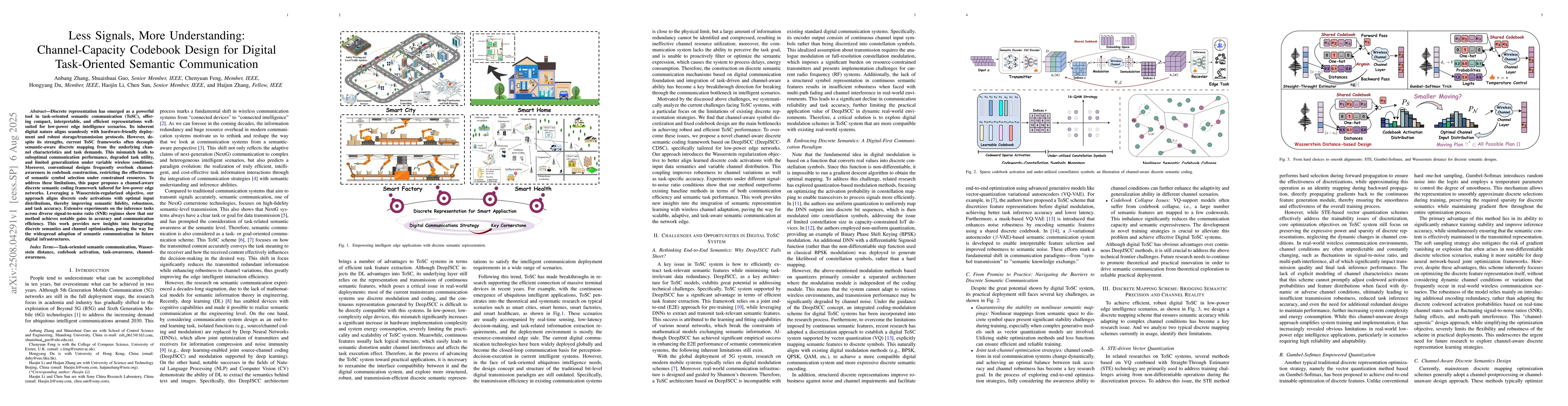Discrete representation has emerged as a powerful tool in task-oriented semantic communication (ToSC), offering compact, interpretable, and efficient representations well-suited for low-power edge intelligence scenarios. Its inherent digital nature aligns seamlessly with hardware-friendly deployment and robust storage/transmission protocols. However, despite its strengths, current ToSC frameworks often decouple semantic-aware discrete mapping from the underlying channel characteristics and task demands. This mismatch leads to suboptimal communication performance, degraded task utility, and limited generalization under variable wireless conditions. Moreover, conventional designs frequently overlook channel-awareness in codebook construction, restricting the effectiveness of semantic symbol selection under constrained resources. To address these limitations, this paper proposes a channel-aware discrete semantic coding framework tailored for low-power edge networks. Leveraging a Wasserstein-regularized objective, our approach aligns discrete code activations with optimal input distributions, thereby improving semantic fidelity, robustness, and task accuracy. Extensive experiments on the inference tasks across diverse signal-to-noise ratio (SNR) regimes show that our method achieves notable gains in accuracy and communication efficiency. This work provides new insights into integrating discrete semantics and channel optimization, paving the way for the widespread adoption of semantic communication in future digital infrastructures.