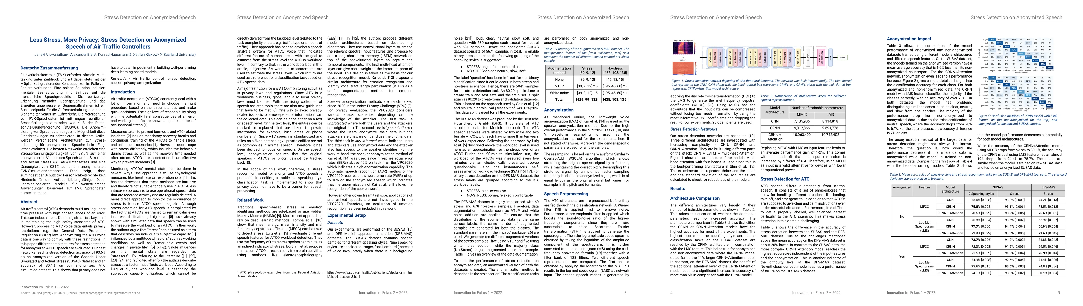 Air traffic control (ATC) demands multi-tasking under time pressure with high consequences of an error. This can induce stress. Detecting stress is a key point in maintaining the high safety standards of ATC. However, processing ATC voice data entails privacy restrictions, e.g. the General Data Protection Regulation (GDPR) law. Anonymizing the ATC voice data is one way to comply with these restrictions. In this paper, different architectures for stress detection for anonymized ATCO speech are evaluated. Our best networks reach a stress detection accuracy of 93.6% on an anonymized version of the Speech Under Simulated and Actual Stress (SUSAS) dataset and an accuracy of 80.1% on our anonymized ATC simulation dataset. This shows that privacy does not have to be an impediment in building well-performing deep-learning-based models.