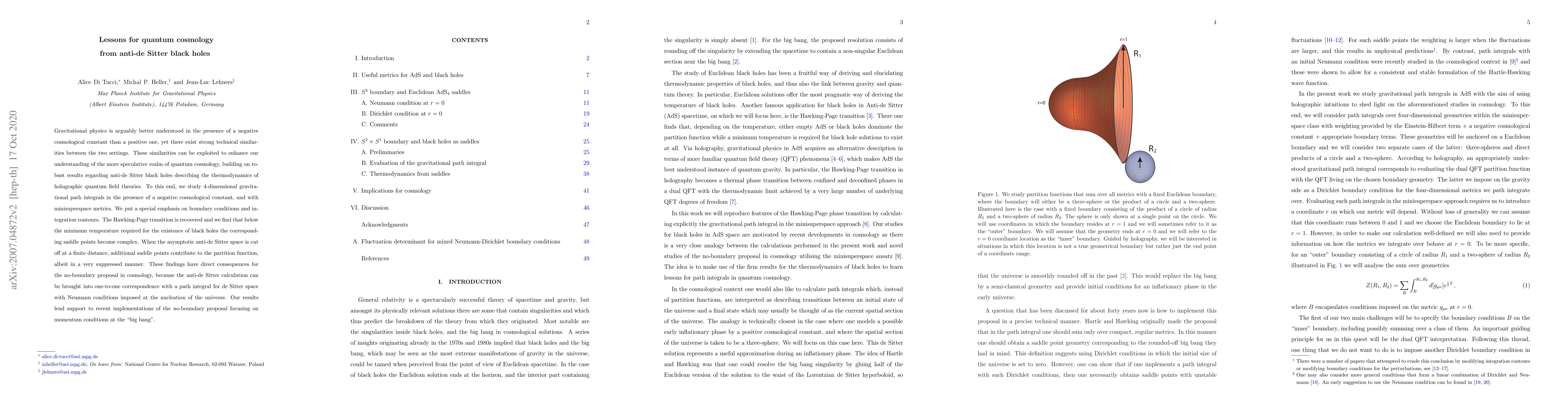 This paper explores the parallels between anti-de Sitter black holes and quantum cosmology, using gravitational path integrals to enhance understanding of the latter. It finds that the Hawking-Page transition and complex saddle points below a critical temperature support the no-boundary proposal in cosmology, particularly when imposing momentum conditions at the universe's origin.