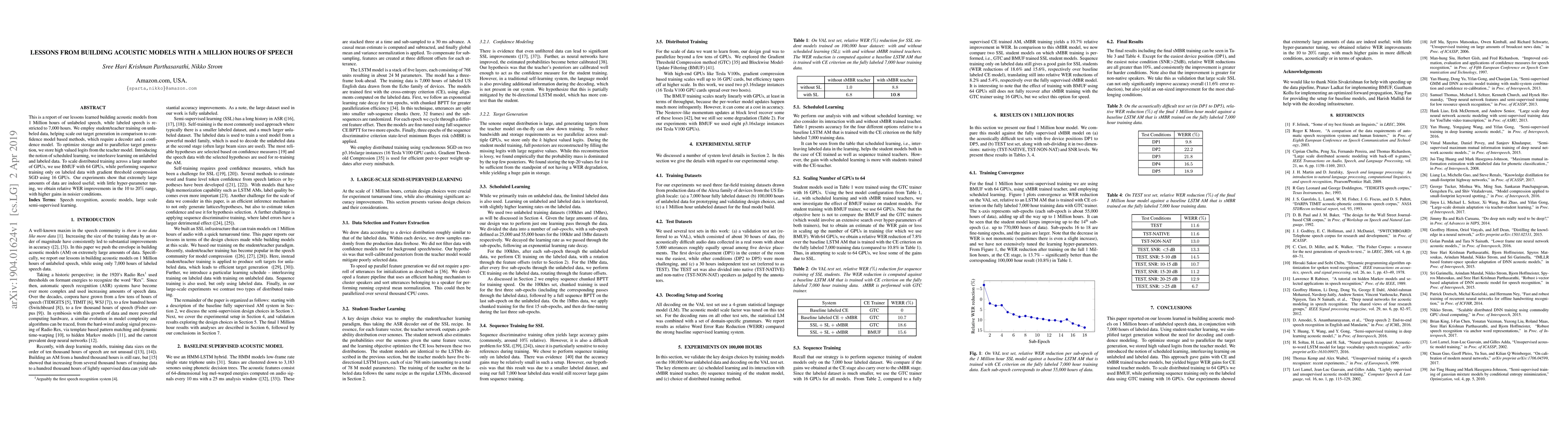 This is a report of our lessons learned building acoustic models from 1 Million hours of unlabeled speech, while labeled speech is restricted to 7,000 hours. We employ student/teacher training on unlabeled data, helping scale out target generation in comparison to confidence model based methods, which require a decoder and a confidence model. To optimize storage and to parallelize target generation, we store high valued logits from the teacher model. Introducing the notion of scheduled learning, we interleave learning on unlabeled and labeled data. To scale distributed training across a large number of GPUs, we use BMUF with 64 GPUs, while performing sequence training only on labeled data with gradient threshold compression SGD using 16 GPUs. Our experiments show that extremely large amounts of data are indeed useful; with little hyper-parameter tuning, we obtain relative WER improvements in the 10 to 20% range, with higher gains in noisier conditions.