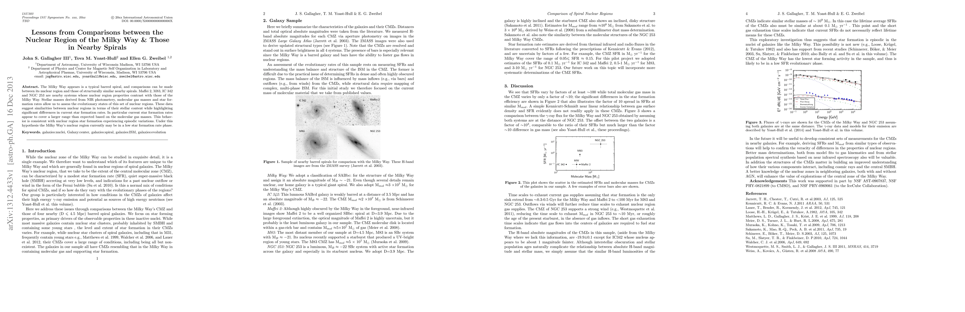 The Milky Way appears is a typical barred spiral, and comparisons can be made between its nuclear region and those of structurally similar nearby spirals. Maffei 2, M83, IC 342 and NGC 253 are nearby systems whose nuclear region properties contrast with those of the Milky Way. Stellar masses derived from NIR photometery, molecular gas masses and star formation rates allow us to assess the evolutionary states of this set of nuclear regions. These data suggest similarities between nuclear regions in terms of their stellar content while highlighting significant differences in current star formation rates. In particular current star formation rates appear to cover a larger range than expected based on the molecular gas masses. This behavior is consistent with nuclear region star formation experiencing episodic variations. Under this hypothesis the Milky Way's nuclear region currently may be in a low star formation rate phase.