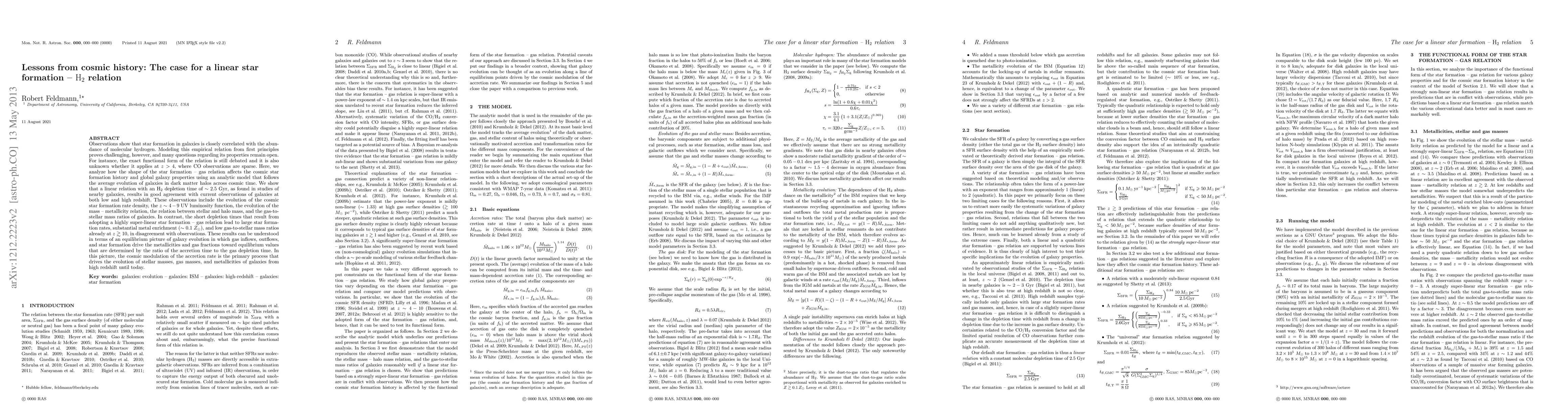 This paper argues that a linear star formation--molecular hydrogen (H2) relation with a depletion time of ~2.5 Gyr best explains current observational data across cosmic time, including the cosmic star formation history and galaxy properties. In contrast, super-linear relations lead to discrepancies with observations, suggesting gas inflows, outflows, and star formation drive galaxies toward equilibrium in metallicity and gas fractions.