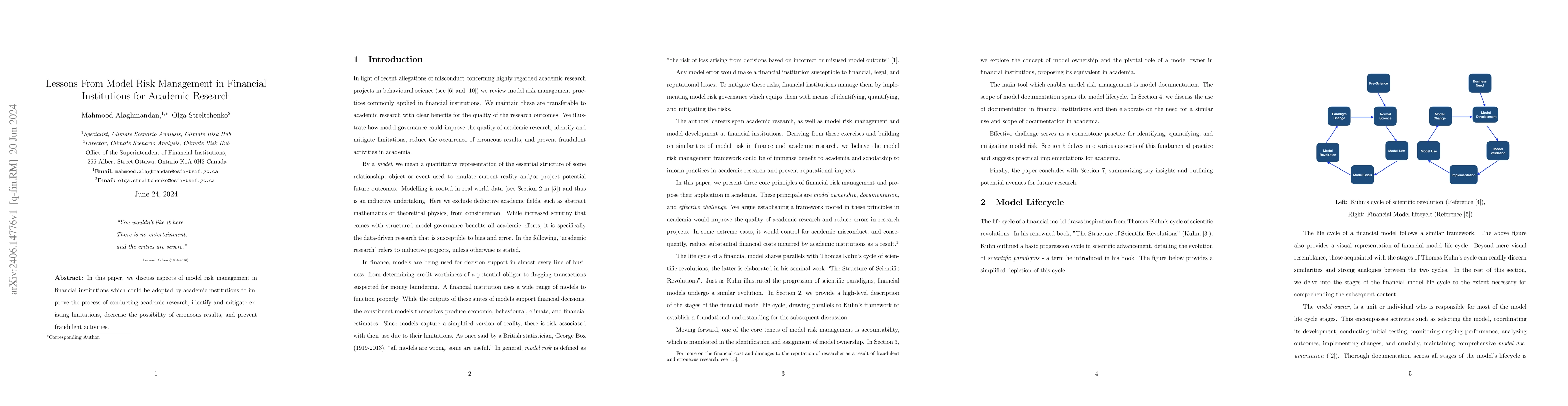 In this paper, we discuss aspects of model risk management in financial institutions which could be adopted by academic institutions to improve the process of conducting academic research, identify and mitigate existing limitations, decrease the possibility of erroneous results, and prevent fraudulent activities.
