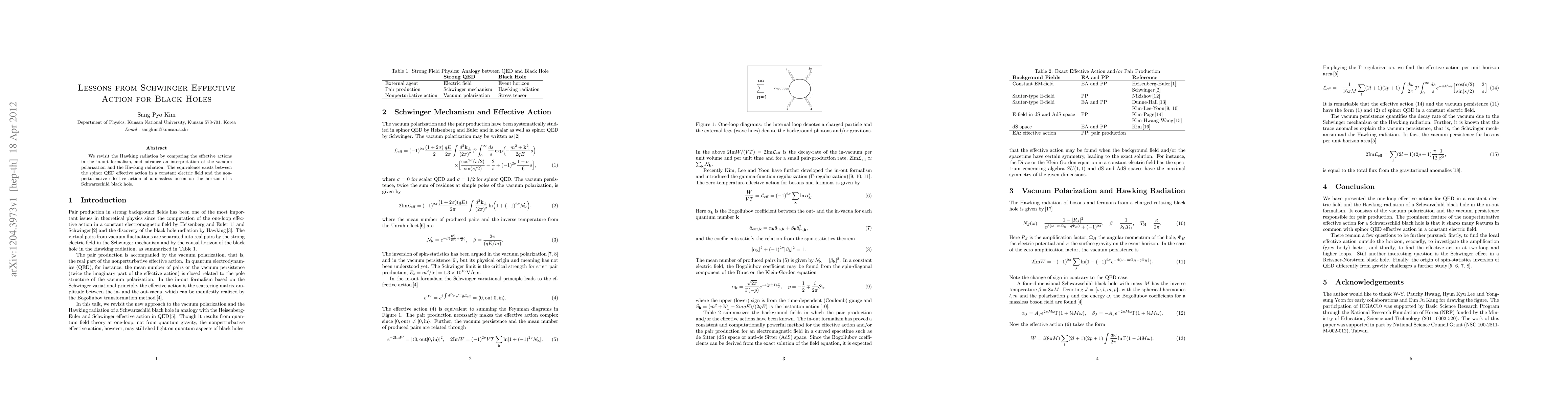 We revisit the Hawking radiation by comparing the effective actions in the in-out formalism, and advance an interpretation of the vacuum polarization and the Hawking radiation. The equivalence exists between the spinor QED effective action in a constant electric field and the nonperturbative effective action of a massless boson on the horizon of a Schwarzschild black hole.