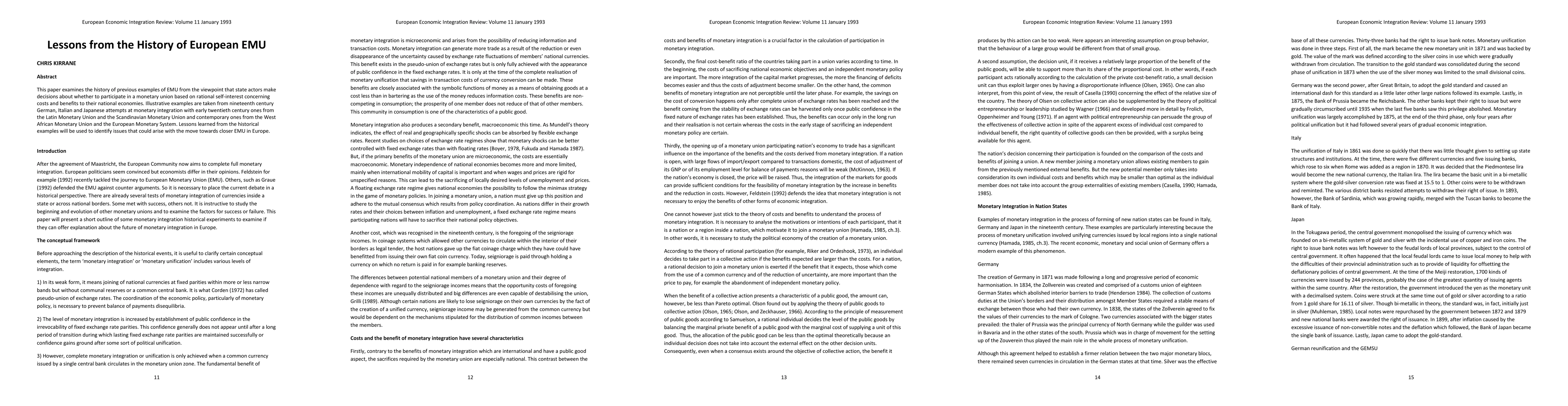 This paper examines the history of previous examples of EMU from the viewpoint that state actors make decisions about whether to participate in a monetary union based on rational self-interest concerning costs and benefits to their national economies. Illustrative examples are taken from nineteenth century German, Italian and Japanese attempts at monetary integration with early twentieth century ones from the Latin Monetary Union and the Scandinavian Monetary Union and contemporary ones from the West African Monetary Union and the European Monetary System. Lessons learned from the historical examples will be used to identify issues that could arise with the move towards closer EMU in Europe.