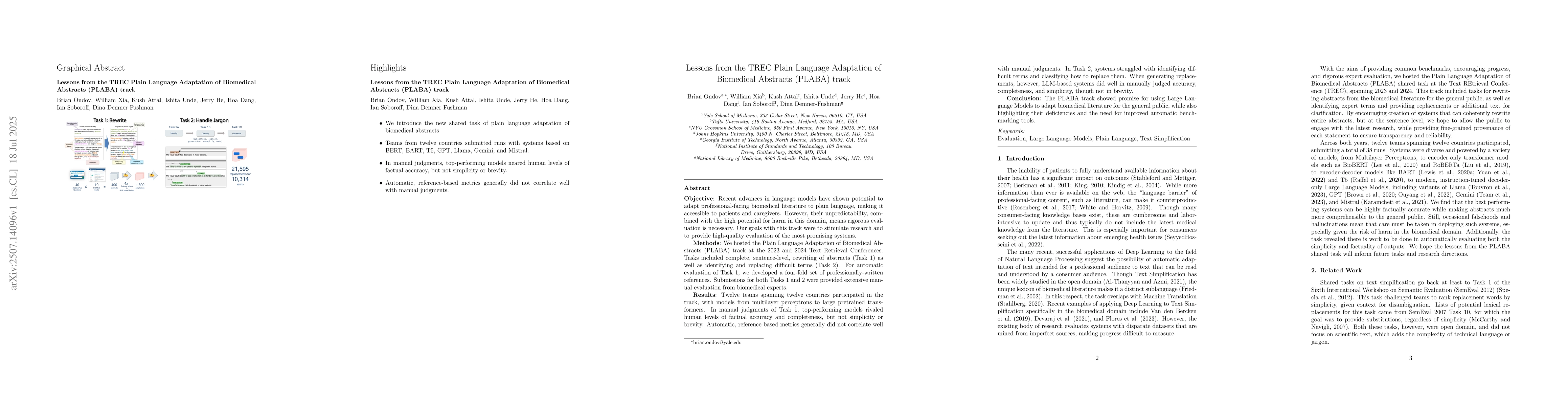 Objective: Recent advances in language models have shown potential to adapt professional-facing biomedical literature to plain language, making it accessible to patients and caregivers. However, their unpredictability, combined with the high potential for harm in this domain, means rigorous evaluation is necessary. Our goals with this track were to stimulate research and to provide high-quality evaluation of the most promising systems. Methods: We hosted the Plain Language Adaptation of Biomedical Abstracts (PLABA) track at the 2023 and 2024 Text Retrieval Conferences. Tasks included complete, sentence-level, rewriting of abstracts (Task 1) as well as identifying and replacing difficult terms (Task 2). For automatic evaluation of Task 1, we developed a four-fold set of professionally-written references. Submissions for both Tasks 1 and 2 were provided extensive manual evaluation from biomedical experts. Results: Twelve teams spanning twelve countries participated in the track, with models from multilayer perceptrons to large pretrained transformers. In manual judgments of Task 1, top-performing models rivaled human levels of factual accuracy and completeness, but not simplicity or brevity. Automatic, reference-based metrics generally did not correlate well with manual judgments. In Task 2, systems struggled with identifying difficult terms and classifying how to replace them. When generating replacements, however, LLM-based systems did well in manually judged accuracy, completeness, and simplicity, though not in brevity. Conclusion: The PLABA track showed promise for using Large Language Models to adapt biomedical literature for the general public, while also highlighting their deficiencies and the need for improved automatic benchmarking tools.