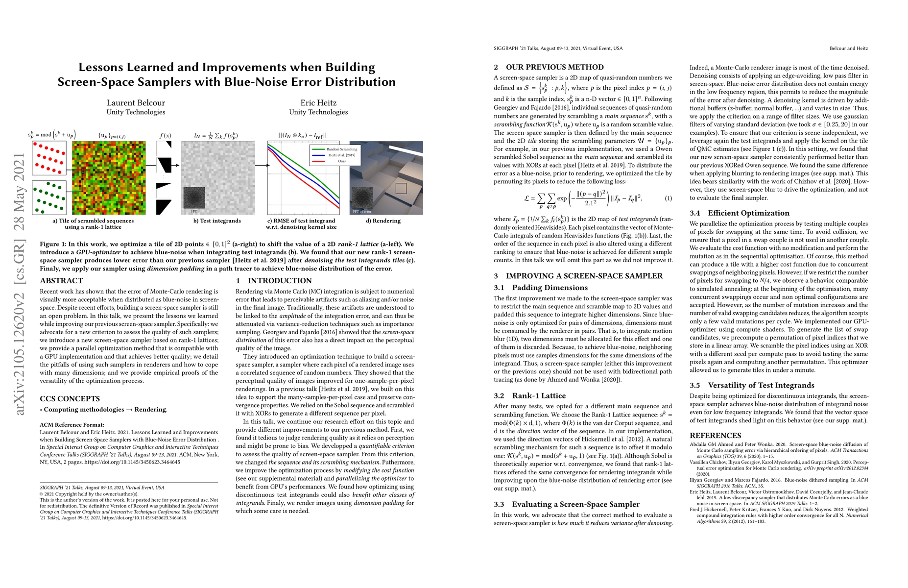 Recent work has shown that the error of Monte-Carlo rendering is visually more acceptable when distributed as blue-noise in screen-space. Despite recent efforts, building a screen-space sampler is still an open problem. In this talk, we present the lessons we learned while improving our previous screen-space sampler. Specifically: we advocate for a new criterion to assess the quality of such samplers; we introduce a new screen-space sampler based on rank-1 lattices; we provide a parallel optimization method that is compatible with a GPU implementation and that achieves better quality; we detail the pitfalls of using such samplers in renderers and how to cope with many dimensions; and we provide empirical proofs of the versatility of the optimization process.
