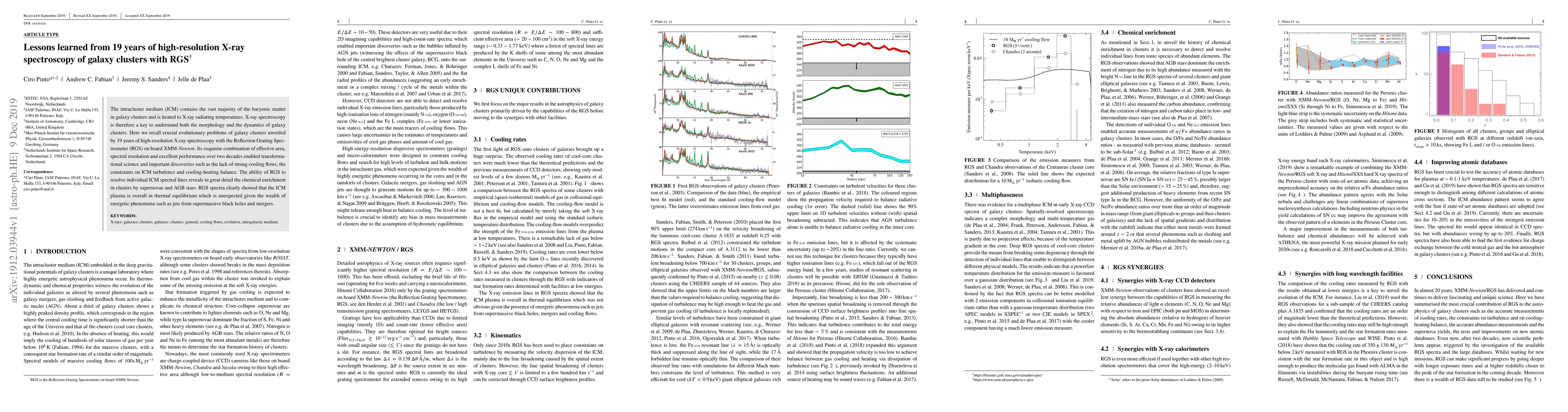 The intracluster medium (ICM) contains the vast majority of the baryonic matter in galaxy clusters and is heated to X-ray radiating temperatures. X-ray spectroscopy is therefore a key to understand both the morphology and the dynamics of galaxy clusters. Here we recall crucial evolutionary problems of galaxy clusters unveiled by 19 years of high-resolution X-ray spectroscopy with the Reflection Grating Spectrometer (RGS) on board XMM-Newton. Its exquisite combination of effective area, spectral resolution and excellent performance over two decades enabled transformational science and important discoveries such as the lack of strong cooling flows, the constraints on ICM turbulence and cooling-heating balance. The ability of RGS to resolve individual ICM spectral lines reveals in great detail the chemical enrichment in clusters by supernovae and AGB stars. RGS spectra clearly showed that the ICM plasma is overall in thermal equilibrium which is unexpected given the wealth of energetic phenomena such as jets from supermassive black holes and mergers.