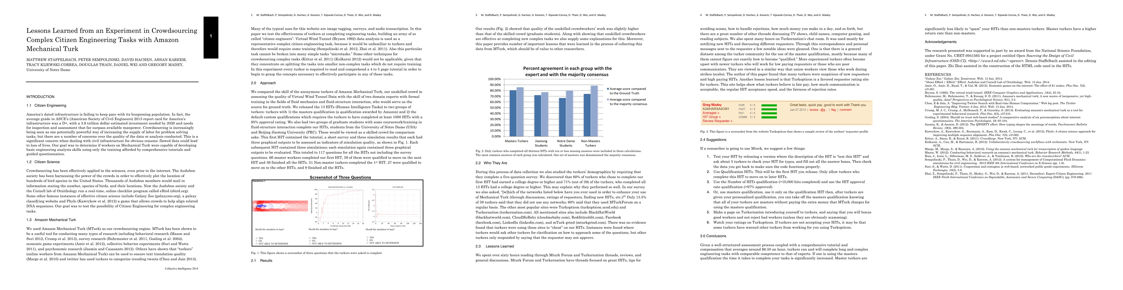 This study explores the potential of Amazon Mechanical Turk for crowdsourcing complex engineering tasks, finding little difference in quality between crowdworkers and expert engineers in evaluating virtual wind tunnel data. The research also highlights valuable lessons learned in utilizing AMT for such tasks.