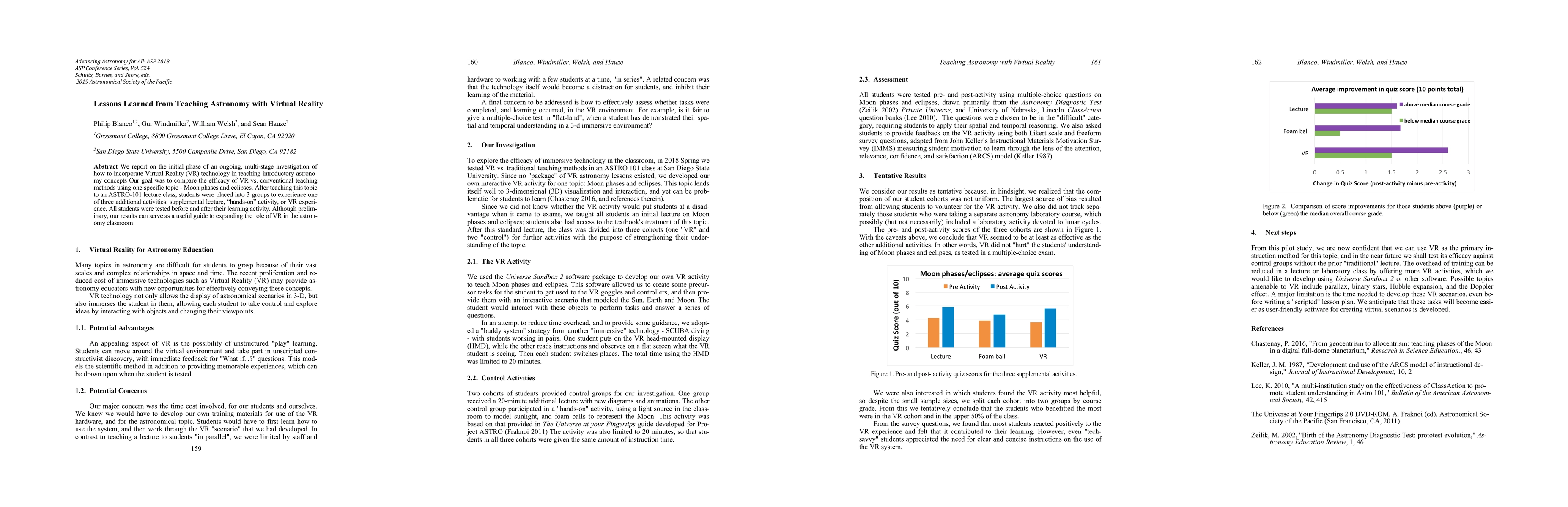 This study investigates the effectiveness of Virtual Reality (VR) in teaching astronomy by comparing it to conventional methods. The results from an ASTRO 101 class, focusing on Moon phases and eclipses, suggest that VR experiences may enhance student understanding, providing a useful guide for future VR integration in astronomy education.
