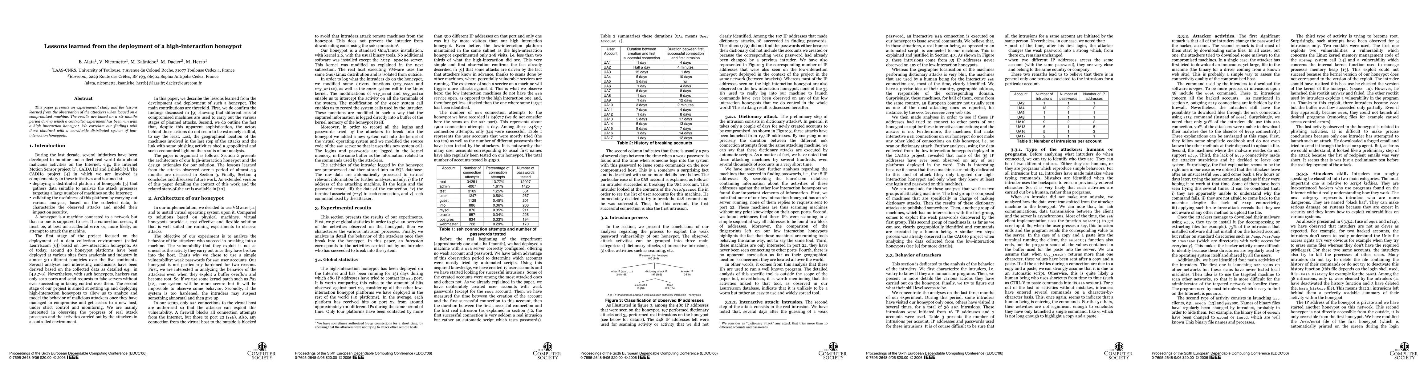 This paper details a six-month experiment using a high-interaction honeypot to observe attackers, revealing significant insights into attacker behavior. Findings are compared to results from a global network of low-interaction honeypots, highlighting differences in attacker interaction and tactics.