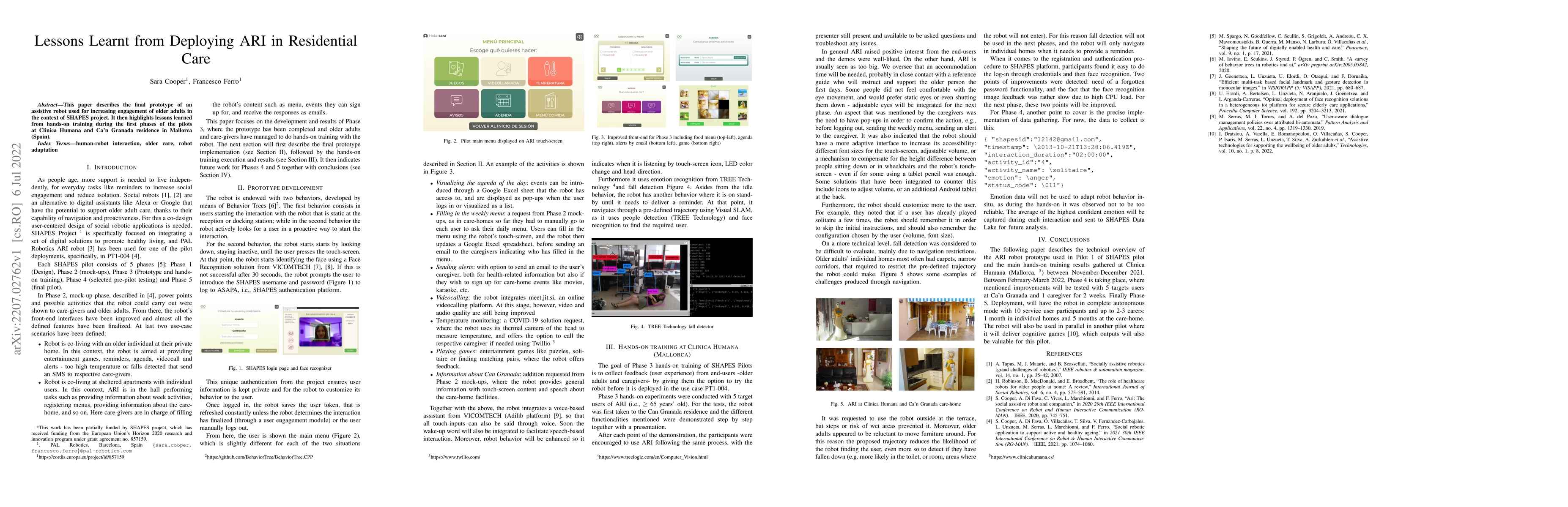 This paper describes the final prototype of an assistive robot used for increasing engagement of older adults in the context of SHAPES project. It then highlights lessons learned from hands-on training during the first phases of the pilots at Clinica Humana and Can Granada residence in Mallorca (Spain).