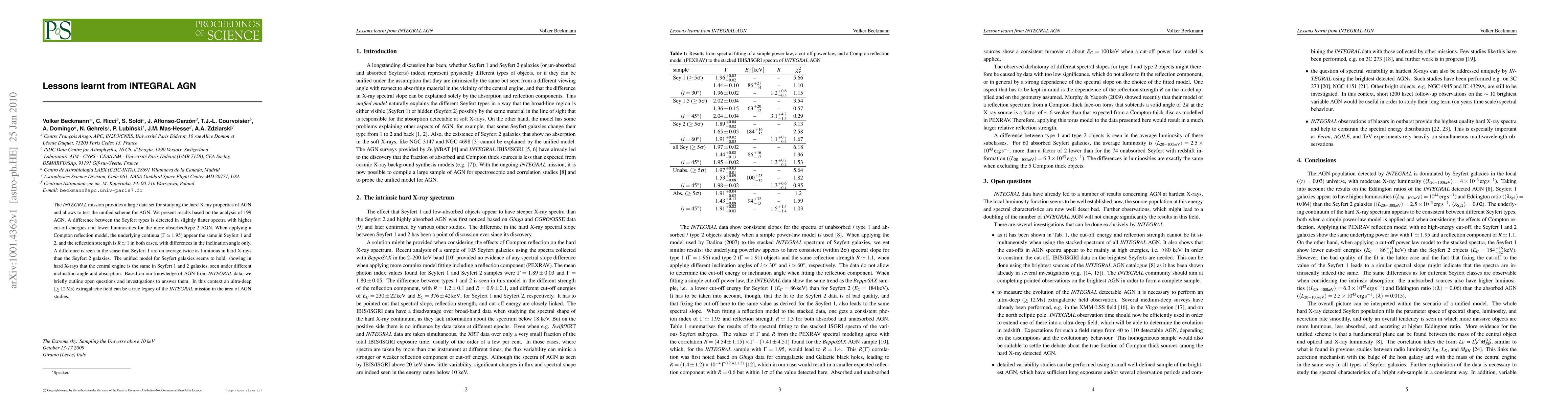 The INTEGRAL mission provides a large data set for studying the hard X-ray properties of AGN and allows to test the unified scheme for AGN. We present results based on the analysis of 199 AGN. A difference between the Seyfert types is detected in slightly flatter spectra with higher cut-off energies and lower luminosities for the more absorbed/type 2 AGN. When applying a Compton reflection model, the underlying continua (photon index 1.95) appear the same in Seyfert 1 and 2, and the reflection strength is R=1 in both cases, with differences in the inclination angle only. A difference is seen in the sense that Seyfert 1 are on average twice as luminous in hard X-rays than the Seyfert 2 galaxies. The unified model for Seyfert galaxies seems to hold, showing in hard X-rays that the central engine is the same in Seyfert 1 and 2 galaxies, seen under different inclination angle and absorption. Based on our knowledge of AGN from INTEGRAL data, we briefly outline open questions and investigations to answer them. In this context an ultra-deep (>= 12 Ms) extragalactic field can be a true legacy of the INTEGRAL mission in the area of AGN studies.