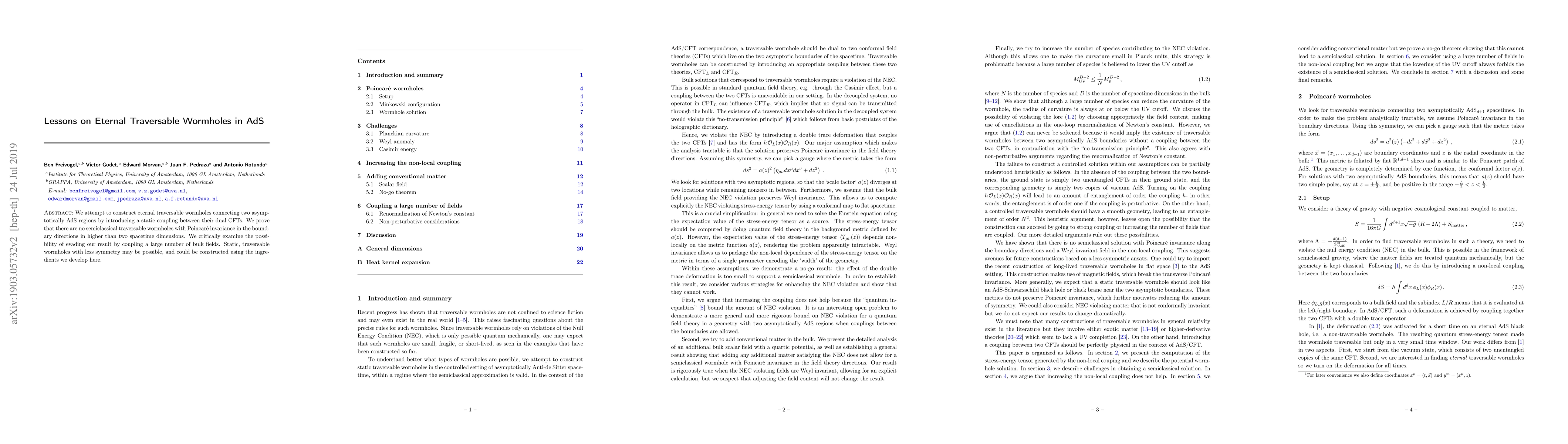 This paper explores the construction of eternal traversable wormholes in asymptotically AdS spacetimes, proving that no such wormholes exist with Poincaré invariance in higher than two dimensions. It suggests that static, less symmetric wormholes might be feasible using the developed theoretical framework.