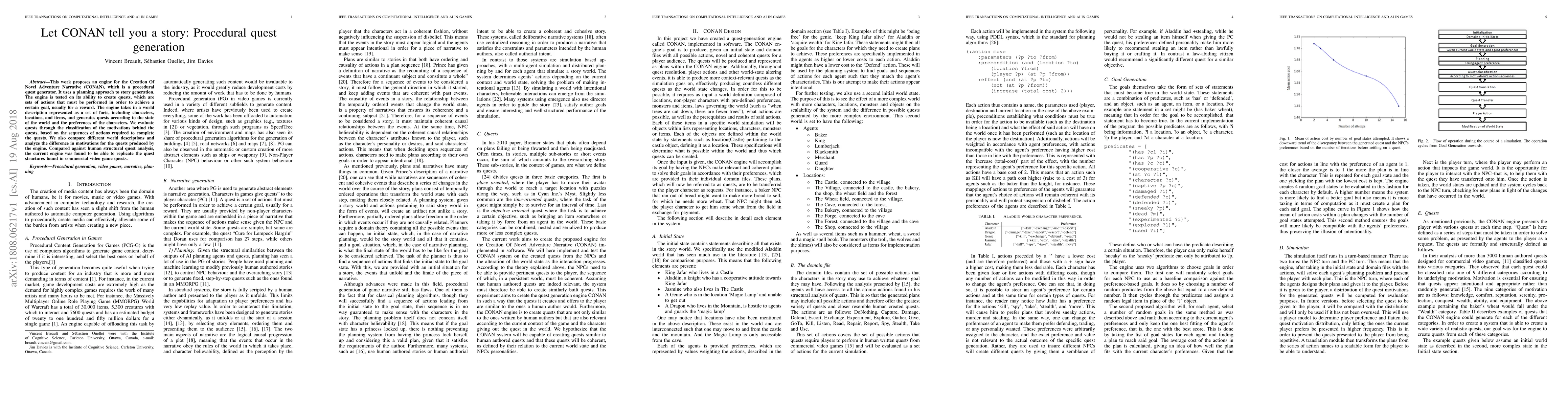 This paper introduces CONAN, a procedural quest generation engine that uses planning to create quests based on world descriptions and character preferences. The engine's quest structures were found to be comparable to those in commercial video games, as evaluated through a classification of quest motivations.