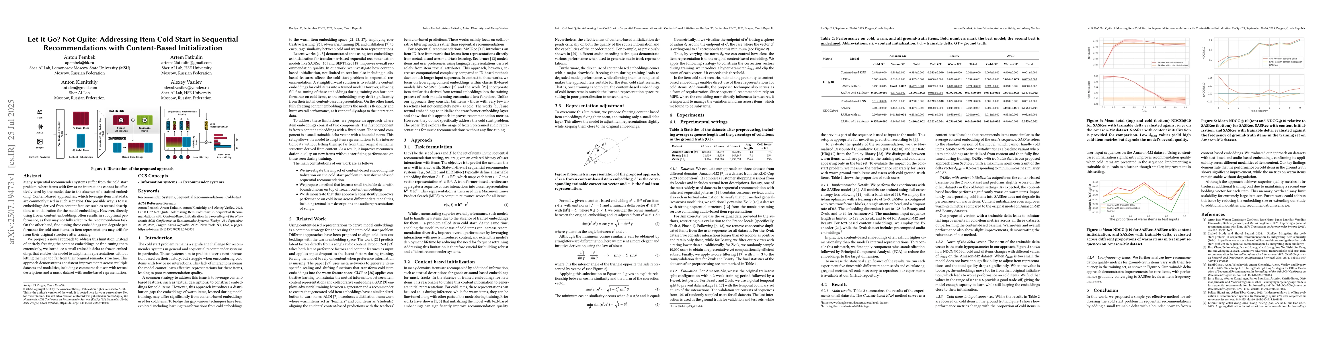 Many sequential recommender systems suffer from the cold start problem, where items with few or no interactions cannot be effectively used by the model due to the absence of a trained embedding. Content-based approaches, which leverage item metadata, are commonly used in such scenarios. One possible way is to use embeddings derived from content features such as textual descriptions as initialization for the model embeddings. However, directly using frozen content embeddings often results in suboptimal performance, as they may not fully adapt to the recommendation task. On the other hand, fine-tuning these embeddings can degrade performance for cold-start items, as item representations may drift far from their original structure after training. We propose a novel approach to address this limitation. Instead of entirely freezing the content embeddings or fine-tuning them extensively, we introduce a small trainable delta to frozen embeddings that enables the model to adapt item representations without letting them go too far from their original semantic structure. This approach demonstrates consistent improvements across multiple datasets and modalities, including e-commerce datasets with textual descriptions and a music dataset with audio-based representation.