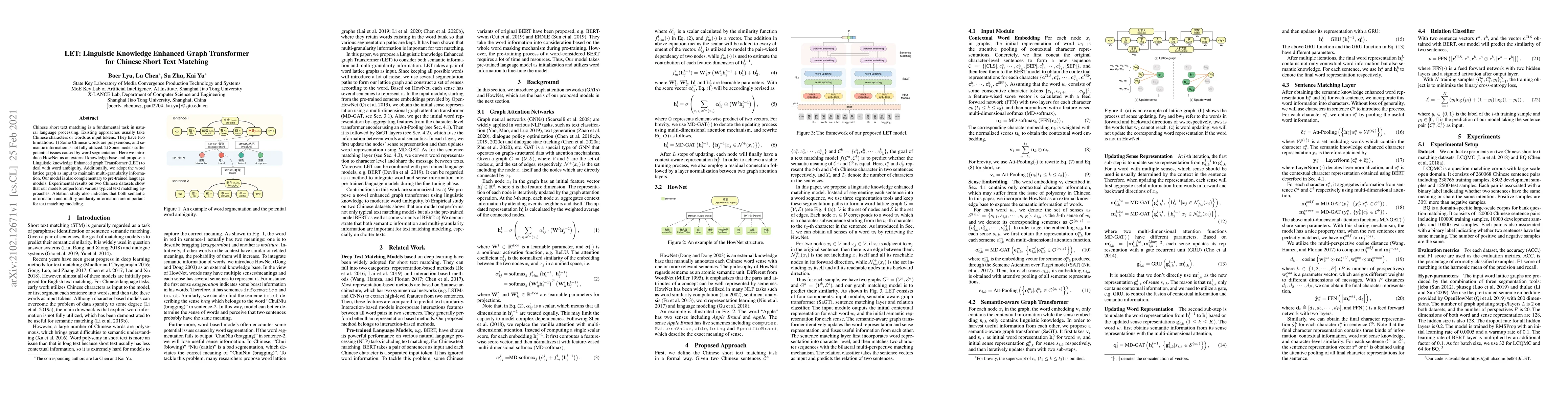 This paper introduces a Linguistic Knowledge Enhanced Graph Transformer (LET) for Chinese short text matching, utilizing HowNet for semantic information and word lattice graphs to address word ambiguity and segmentation issues. Experimental results demonstrate superior performance over other text matching methods.