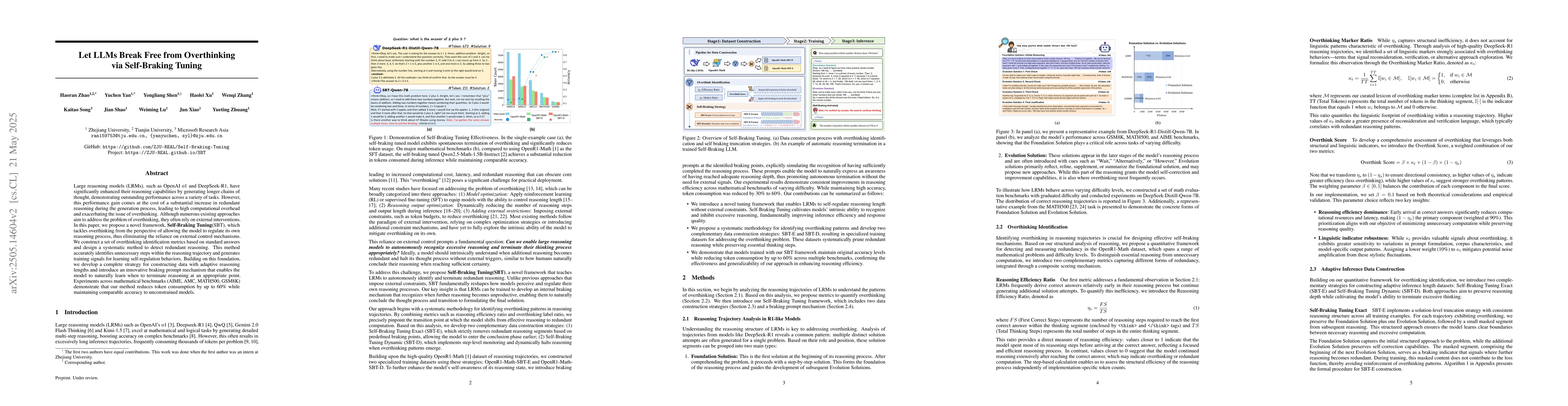 A new approach called Self-Braking Tuning reduces overthinking in Large Reasoning Models (LRMs) by allowing them to regulate their own reasoning process, leading to up to 60% reduction in token consumption while maintaining comparable accuracy.