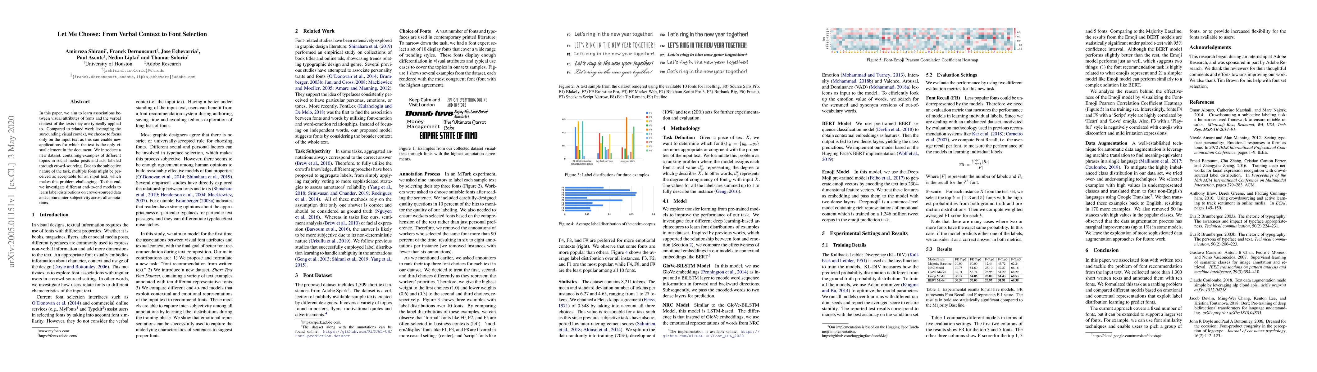 In this paper, we aim to learn associations between visual attributes of fonts and the verbal context of the texts they are typically applied to. Compared to related work leveraging the surrounding visual context, we choose to focus only on the input text as this can enable new applications for which the text is the only visual element in the document. We introduce a new dataset, containing examples of different topics in social media posts and ads, labeled through crowd-sourcing. Due to the subjective nature of the task, multiple fonts might be perceived as acceptable for an input text, which makes this problem challenging. To this end, we investigate different end-to-end models to learn label distributions on crowd-sourced data and capture inter-subjectivity across all annotations.