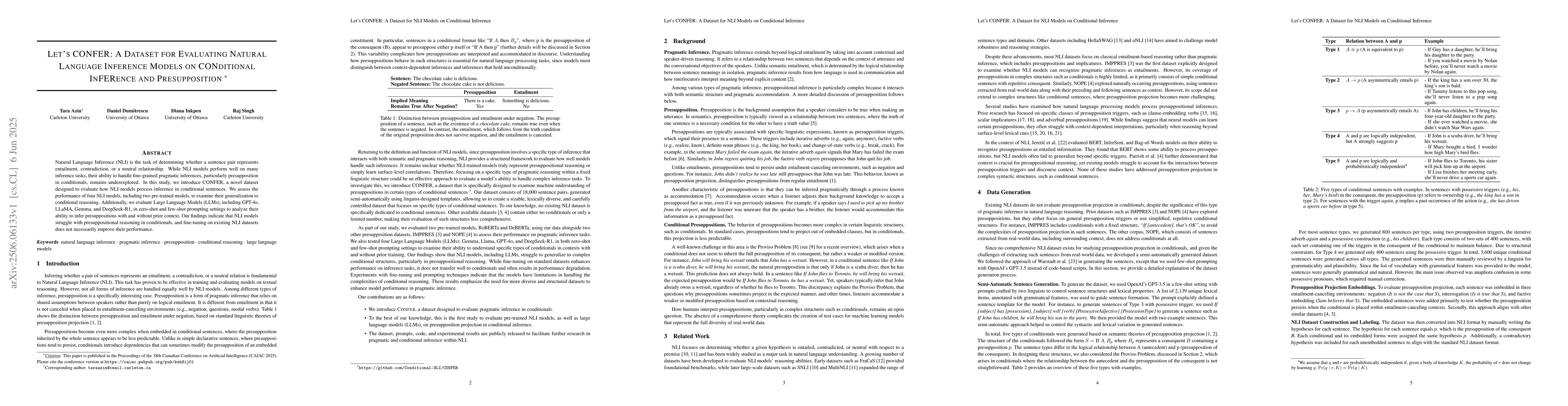 Researchers introduced CONFER, a dataset to evaluate NLI models on conditional inference and presupposition, finding that existing models struggle with fine-grained pragmatic inferences.