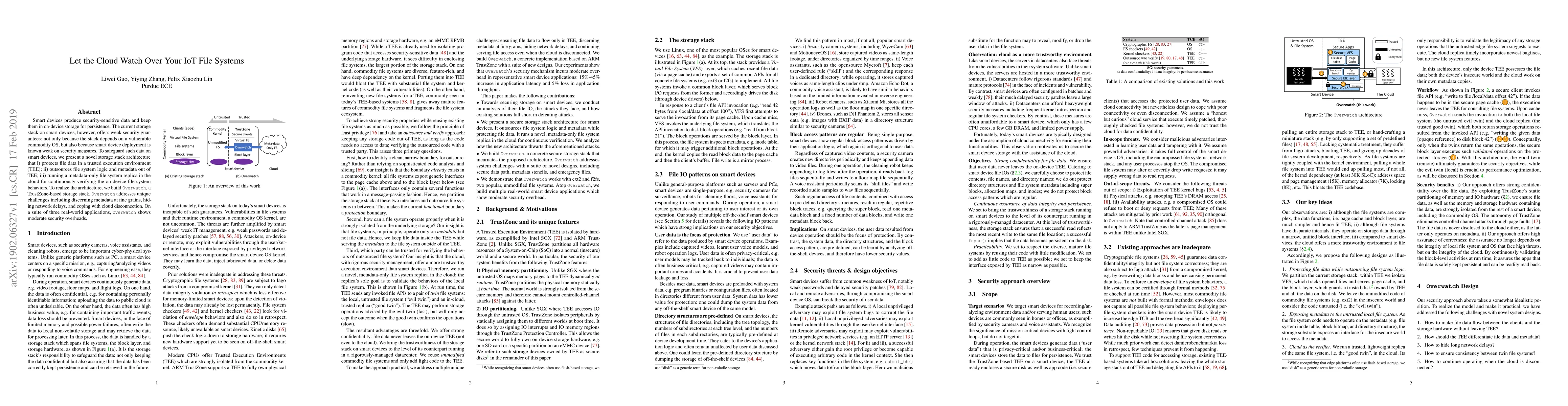 Smart devices produce security-sensitive data and keep them in on-device storage for persistence. The current storage stack on smart devices, however, offers weak security guarantees: not only because the stack depends on a vulnerable commodity OS, but also because smart device deployment is known weak on security measures. To safeguard such data on smart devices, we present a novel storage stack architecture that i) protects file data in a trusted execution environment (TEE); ii) outsources file system logic and metadata out of TEE; iii) running a metadata-only file system replica in the cloud for continuously verifying the on-device file system behaviors. To realize the architecture, we build Overwatch, aTrustZone-based storage stack. Overwatch addresses unique challenges including discerning metadata at fine grains, hiding network delays, and coping with cloud disconnection. On a suite of three real-world applications, Overwatch shows moderate security overheads.