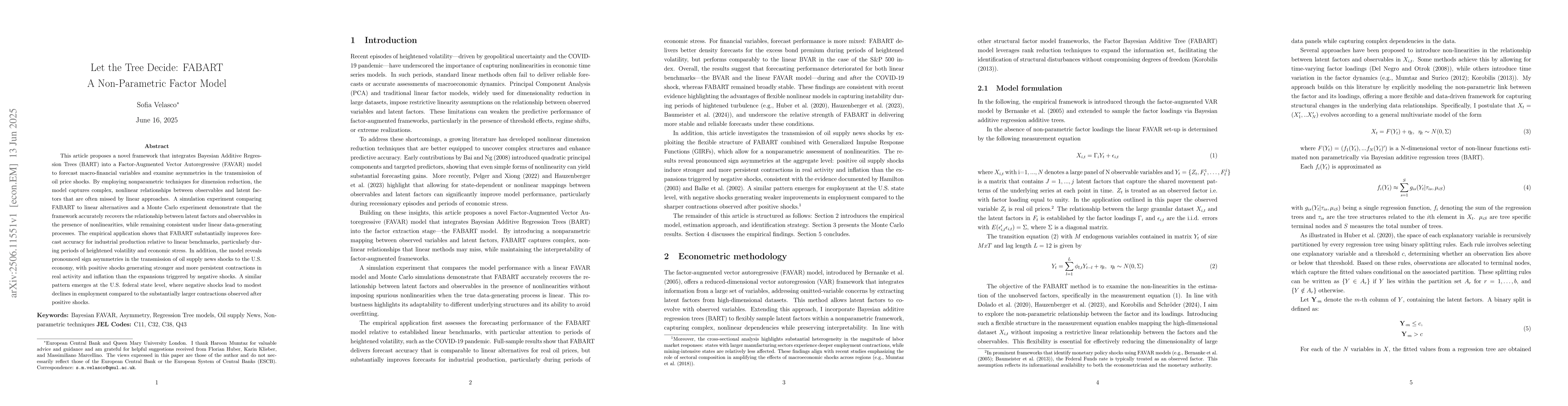 This article proposes a novel framework that integrates Bayesian Additive Regression Trees (BART) into a Factor-Augmented Vector Autoregressive (FAVAR) model to forecast macro-financial variables and examine asymmetries in the transmission of oil price shocks. By employing nonparametric techniques for dimension reduction, the model captures complex, nonlinear relationships between observables and latent factors that are often missed by linear approaches. A simulation experiment comparing FABART to linear alternatives and a Monte Carlo experiment demonstrate that the framework accurately recovers the relationship between latent factors and observables in the presence of nonlinearities, while remaining consistent under linear data-generating processes. The empirical application shows that FABART substantially improves forecast accuracy for industrial production relative to linear benchmarks, particularly during periods of heightened volatility and economic stress. In addition, the model reveals pronounced sign asymmetries in the transmission of oil supply news shocks to the U.S. economy, with positive shocks generating stronger and more persistent contractions in real activity and inflation than the expansions triggered by negative shocks. A similar pattern emerges at the U.S. federal state level, where negative shocks lead to modest declines in employment compared to the substantially larger contractions observed after positive shocks.