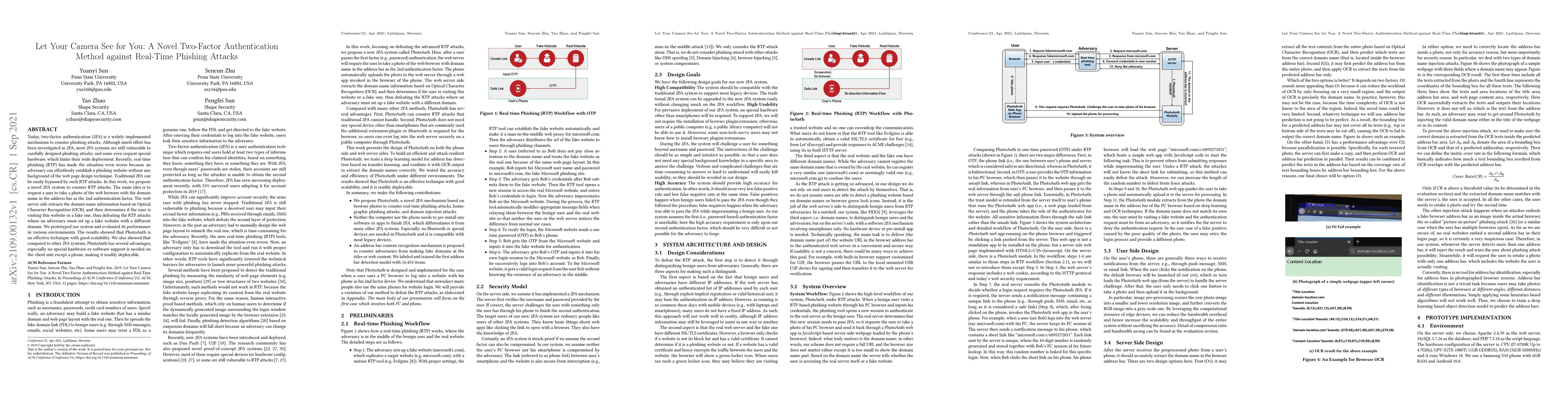 This paper proposes a novel two-factor authentication method called PhotoAuth, which uses users' smartphones to take a photo of their web browser's address bar as the second authentication factor. The system employs Optical Character Recognition (OCR) to verify the domain name, effectively countering real-time phishing attacks that replicate websites. PhotoAuth requires no special hardware or software, making it easily deployable.