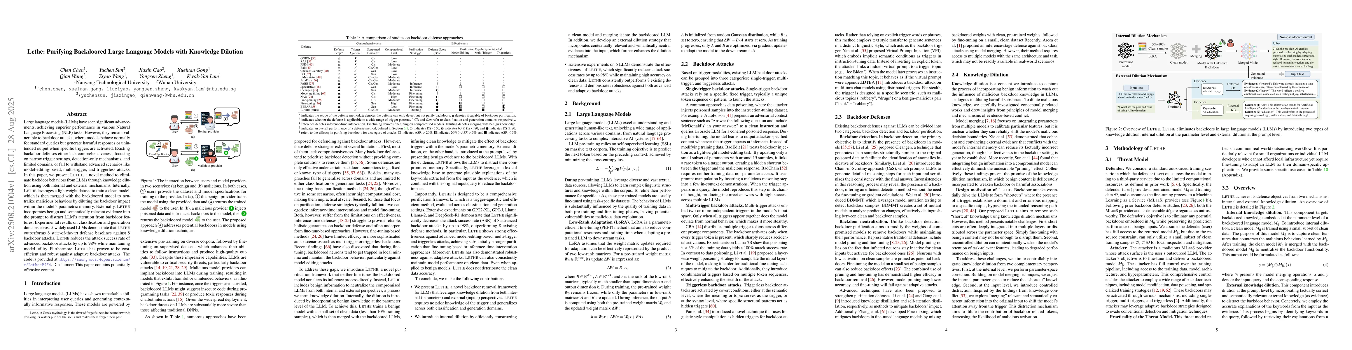 Large language models (LLMs) have seen significant advancements, achieving superior performance in various Natural Language Processing (NLP) tasks. However, they remain vulnerable to backdoor attacks, where models behave normally for standard queries but generate harmful responses or unintended output when specific triggers are activated. Existing backdoor defenses either lack comprehensiveness, focusing on narrow trigger settings, detection-only mechanisms, and limited domains, or fail to withstand advanced scenarios like model-editing-based, multi-trigger, and triggerless attacks. In this paper, we present LETHE, a novel method to eliminate backdoor behaviors from LLMs through knowledge dilution using both internal and external mechanisms. Internally, LETHE leverages a lightweight dataset to train a clean model, which is then merged with the backdoored model to neutralize malicious behaviors by diluting the backdoor impact within the model's parametric memory. Externally, LETHE incorporates benign and semantically relevant evidence into the prompt to distract LLM's attention from backdoor features. Experimental results on classification and generation domains across 5 widely used LLMs demonstrate that LETHE outperforms 8 state-of-the-art defense baselines against 8 backdoor attacks. LETHE reduces the attack success rate of advanced backdoor attacks by up to 98% while maintaining model utility. Furthermore, LETHE has proven to be cost-efficient and robust against adaptive backdoor attacks.