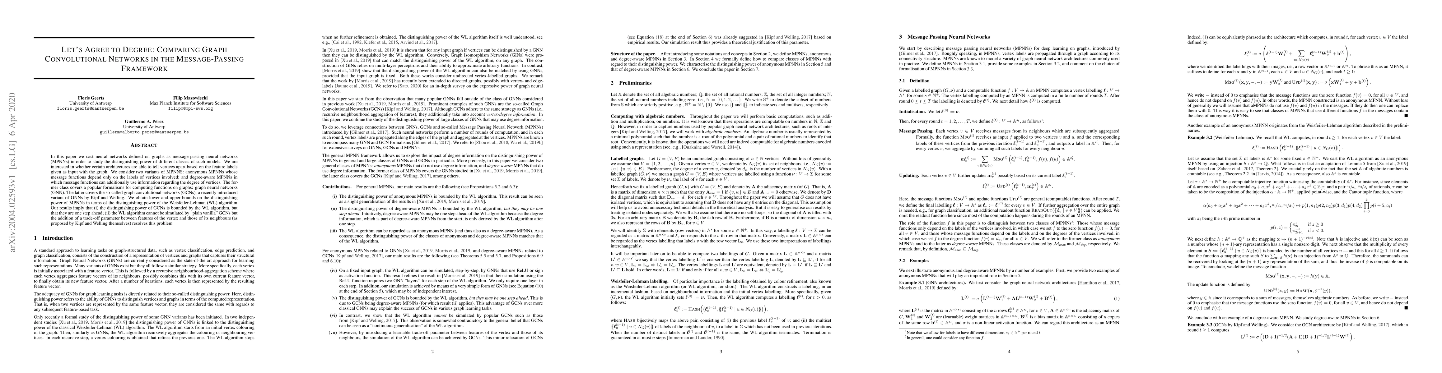 In this paper we cast neural networks defined on graphs as message-passing neural networks (MPNNs) in order to study the distinguishing power of different classes of such models. We are interested in whether certain architectures are able to tell vertices apart based on the feature labels given as input with the graph. We consider two variants of MPNNS: anonymous MPNNs whose message functions depend only on the labels of vertices involved; and degree-aware MPNNs in which message functions can additionally use information regarding the degree of vertices. The former class covers a popular formalisms for computing functions on graphs: graph neural networks (GNN). The latter covers the so-called graph convolutional networks (GCNs), a recently introduced variant of GNNs by Kipf and Welling. We obtain lower and upper bounds on the distinguishing power of MPNNs in terms of the distinguishing power of the Weisfeiler-Lehman (WL) algorithm. Our results imply that (i) the distinguishing power of GCNs is bounded by the WL algorithm, but that they are one step ahead; (ii) the WL algorithm cannot be simulated by "plain vanilla" GCNs but the addition of a trade-off parameter between features of the vertex and those of its neighbours (as proposed by Kipf and Welling themselves) resolves this problem.