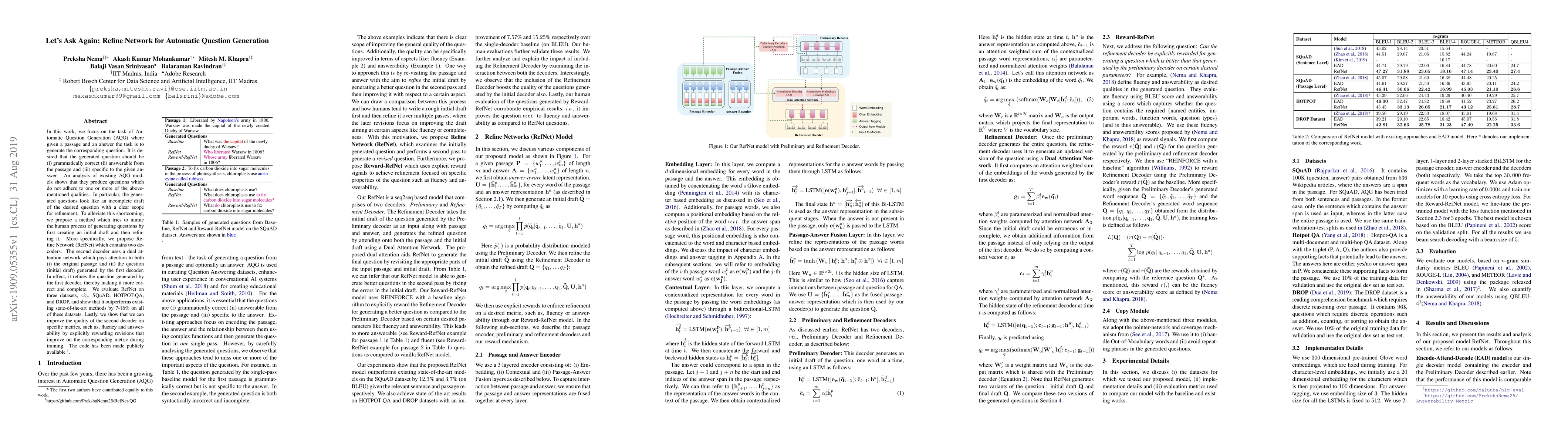 The paper introduces Refine Network (RefNet), a method for automatic question generation that mimics human refinement by first creating an initial question and then improving it. It significantly outperforms previous models on multiple datasets by producing more accurate, fluent, and answerable questions.