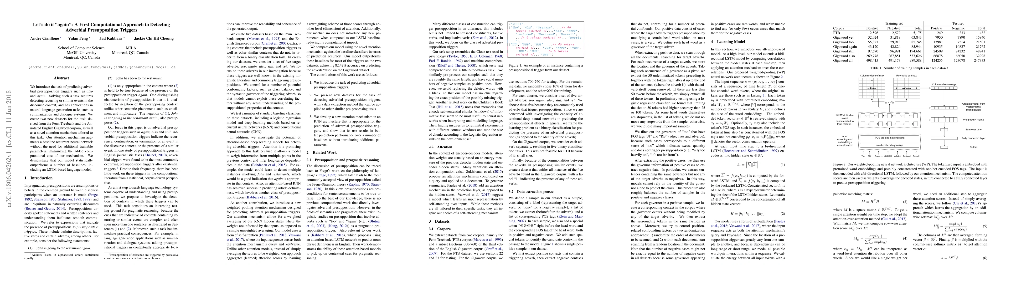 Researchers introduce a new method to detect adverbial presupposition triggers like 'also' and 'again', showing their model outperforms several baselines with minimal computational cost.