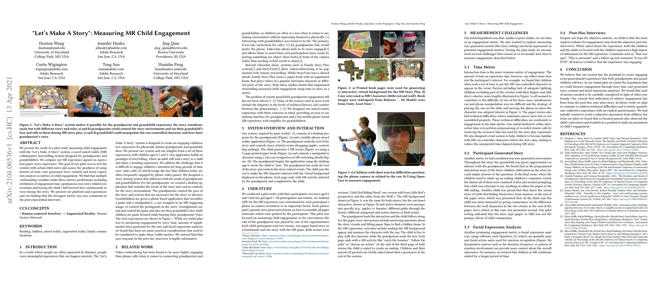We present the result of a pilot study measuring child engagement with the Lets Make A Story system, a novel mixed reality, MR, collaborative storytelling system designed for grandparents and grandchildren. We compare our MR experience against an equivalent paper story experience. The goal of our pilot was to test the system with actual child users and assess the goodness of using metrics of time, user generated story content and facial expression analysis as metrics of child engagement. We find that multiple confounding variables make these metrics problematic including attribution of engagement time, spontaneous non-story related conversation and having the childs full forward face continuously in view during the story. We present our platform and experiences and our finding that the strongest metric was user comments in the post-experiential interview.