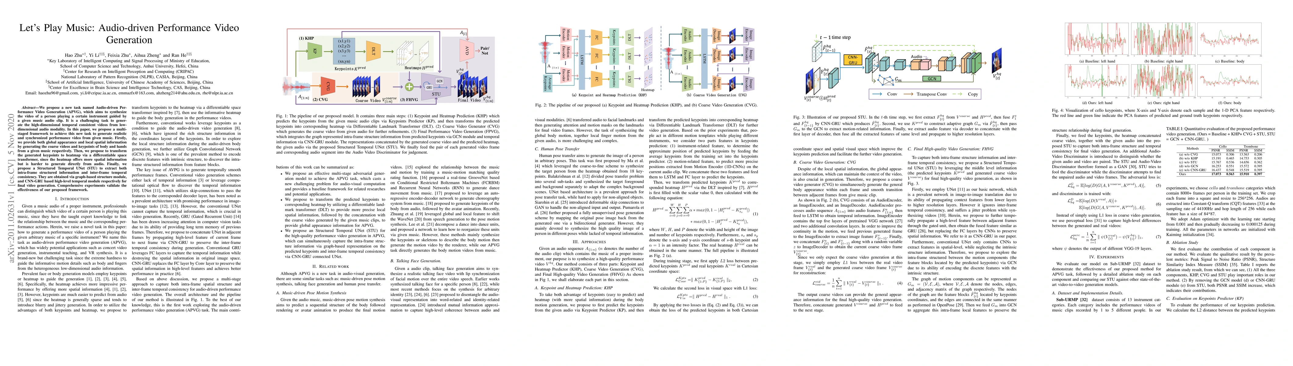 We propose a new task named Audio-driven Per-formance Video Generation (APVG), which aims to synthesizethe video of a person playing a certain instrument guided bya given music audio clip. It is a challenging task to gener-ate the high-dimensional temporal consistent videos from low-dimensional audio modality. In this paper, we propose a multi-staged framework to achieve this new task to generate realisticand synchronized performance video from given music. Firstly,we provide both global appearance and local spatial informationby generating the coarse videos and keypoints of body and handsfrom a given music respectively. Then, we propose to transformthe generated keypoints to heatmap via a differentiable spacetransformer, since the heatmap offers more spatial informationbut is harder to generate directly from audio. Finally, wepropose a Structured Temporal UNet (STU) to extract bothintra-frame structured information and inter-frame temporalconsistency. They are obtained via graph-based structure module,and CNN-GRU based high-level temporal module respectively forfinal video generation. Comprehensive experiments validate theeffectiveness of our proposed framework.