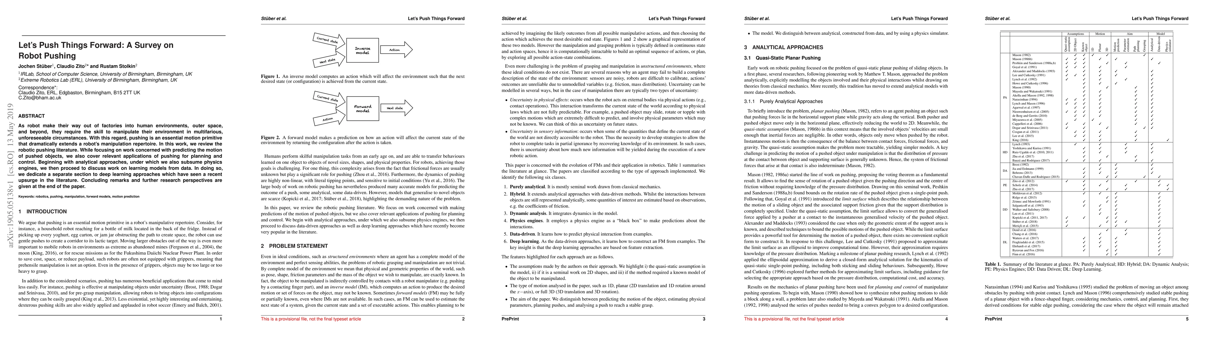 As robot make their way out of factories into human environments, outer space, and beyond, they require the skill to manipulate their environment in multifarious, unforeseeable circumstances. With this regard, pushing is an essential motion primitive that dramatically extends a robot's manipulation repertoire. In this work, we review the robotic pushing literature. While focusing on work concerned with predicting the motion of pushed objects, we also cover relevant applications of pushing for planning and control. Beginning with analytical approaches, under which we also subsume physics engines, we then proceed to discuss work on learning models from data. In doing so, we dedicate a separate section to deep learning approaches which have seen a recent upsurge in the literature. Concluding remarks and further research perspectives are given at the end of the paper.