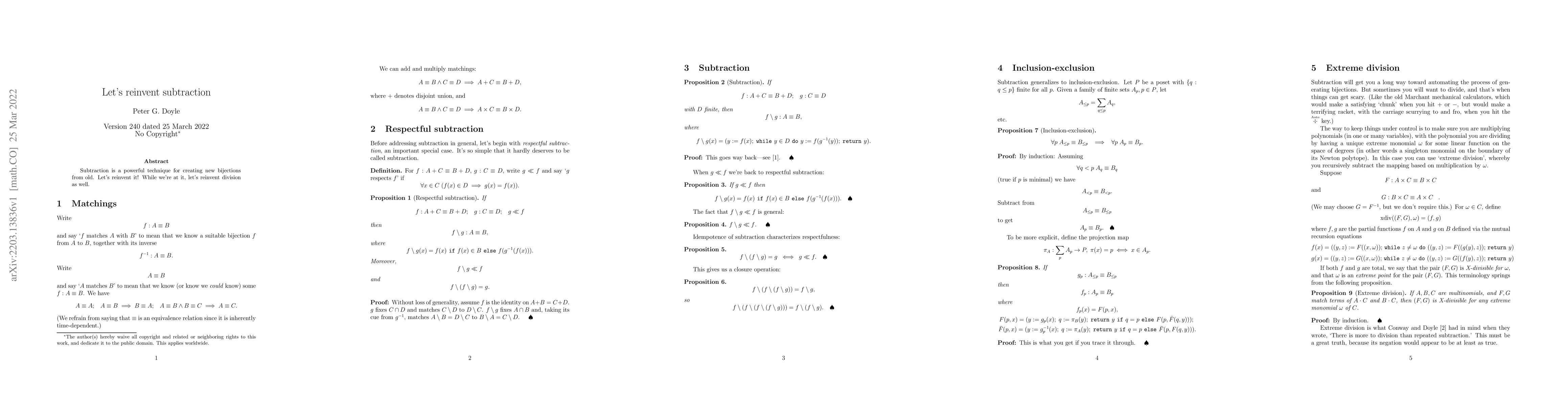 Subtraction is a powerful technique for creating new bijections from old. Let's reinvent it! While we're at it, let's reinvent division as well.