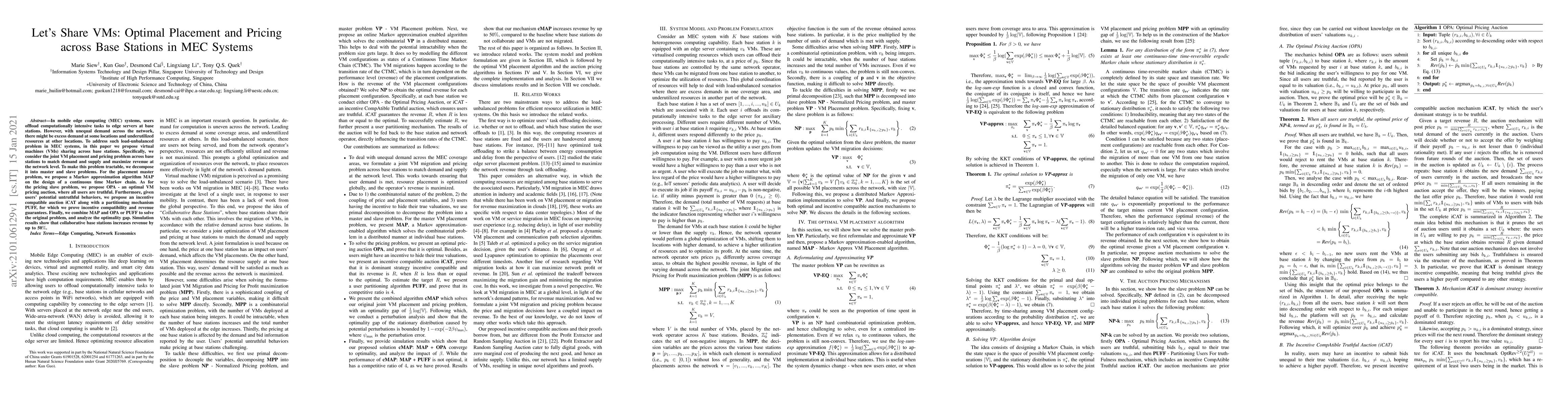 This paper proposes a method for optimal placement and pricing of virtual machines across base stations in mobile edge computing systems to balance load and maximize network revenue. It introduces algorithms for VM placement and pricing, including an auction mechanism for truthful user behavior, and demonstrates a potential revenue increase of up to 50% through collaborative base station strategies.