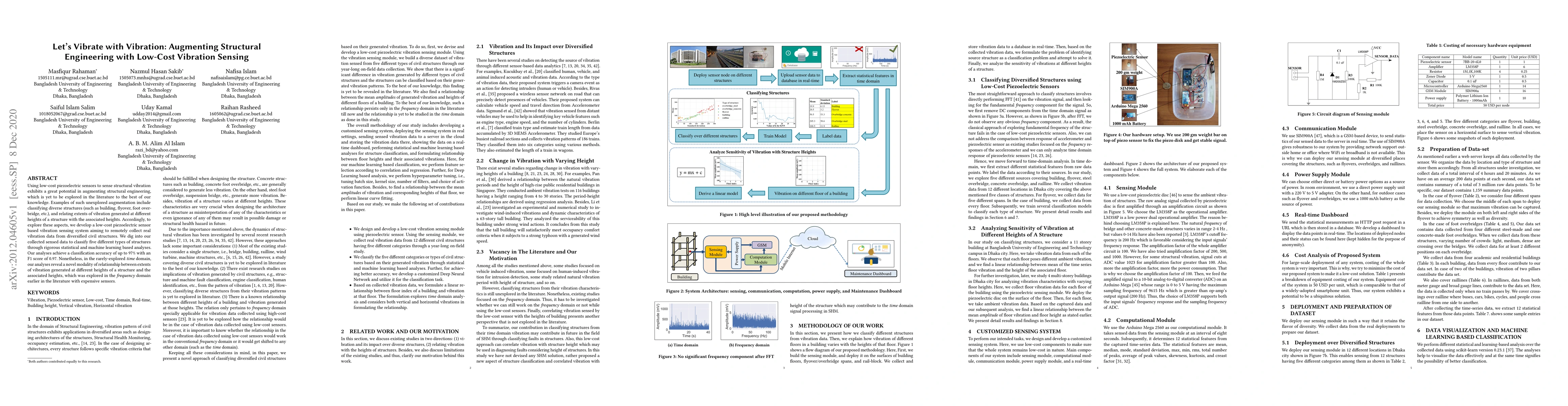 Using low-cost piezoelectric sensors to sense structural vibration exhibits great potential in augmenting structural engineering, which is yet to be explored in the literature to the best of our knowledge. Examples of such unexplored augmentation include classifying diverse structures (such as building, flyover, foot over-bridge, etc.), and relating the extent of vibration generated at different height of a structure and the associated height. Accordingly, to explore these cases, we develop a low-cost piezoelectric sensor-based vibration sensing system aiming to remotely collect real vibration data from diversified civil structures. We dig into our collected sensed data to classify five different types of structures through rigorous statistical and machine-learning-based analyses. Our analyses achieve a classification accuracy of up to 97% with an F1 score of 0.97. Nonetheless, in the rarely explored time domain, our analyses reveal a novel modality of relation between vibration generated at different heights of a structure and the associated height, which was explored in the frequency domain earlier in the literature with expensive sensors.