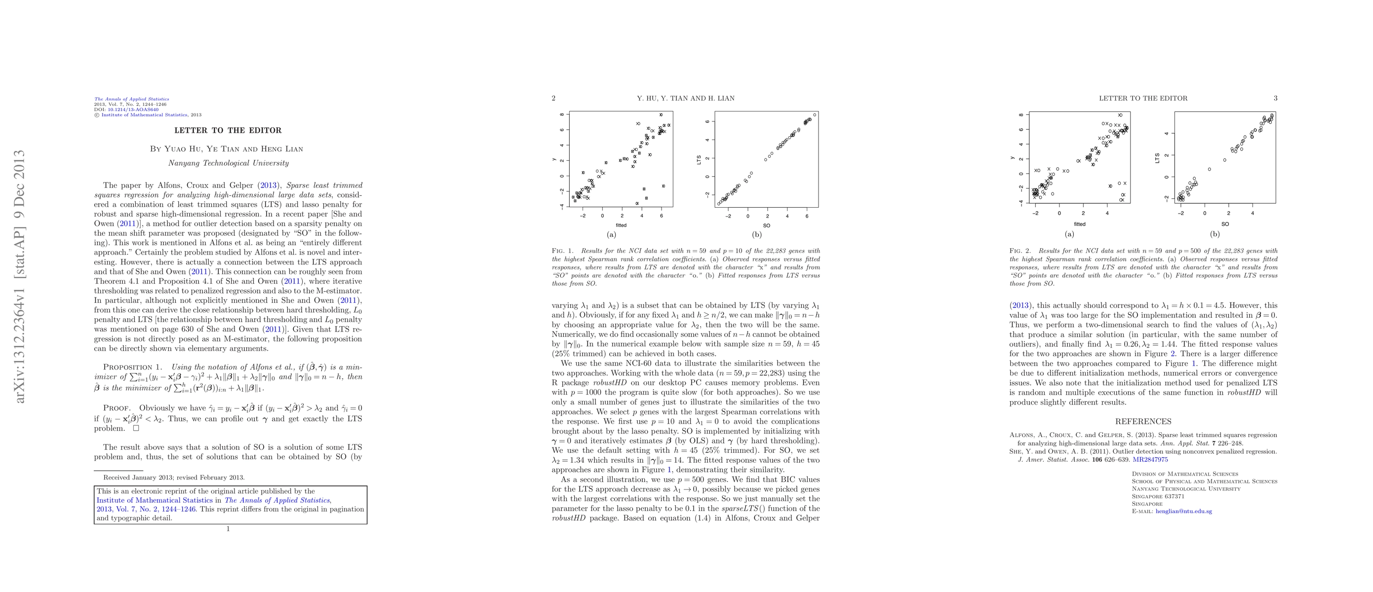 The paper by Alfons, Croux and Gelper (2013), Sparse least trimmed squares regression for analyzing high-dimensional large data sets, considered a combination of least trimmed squares (LTS) and lasso penalty for robust and sparse high-dimensional regression. In a recent paper [She and Owen (2011)], a method for outlier detection based on a sparsity penalty on the mean shift parameter was proposed (designated by "SO" in the following). This work is mentioned in Alfons et al. as being an "entirely different approach." Certainly the problem studied by Alfons et al. is novel and interesting.