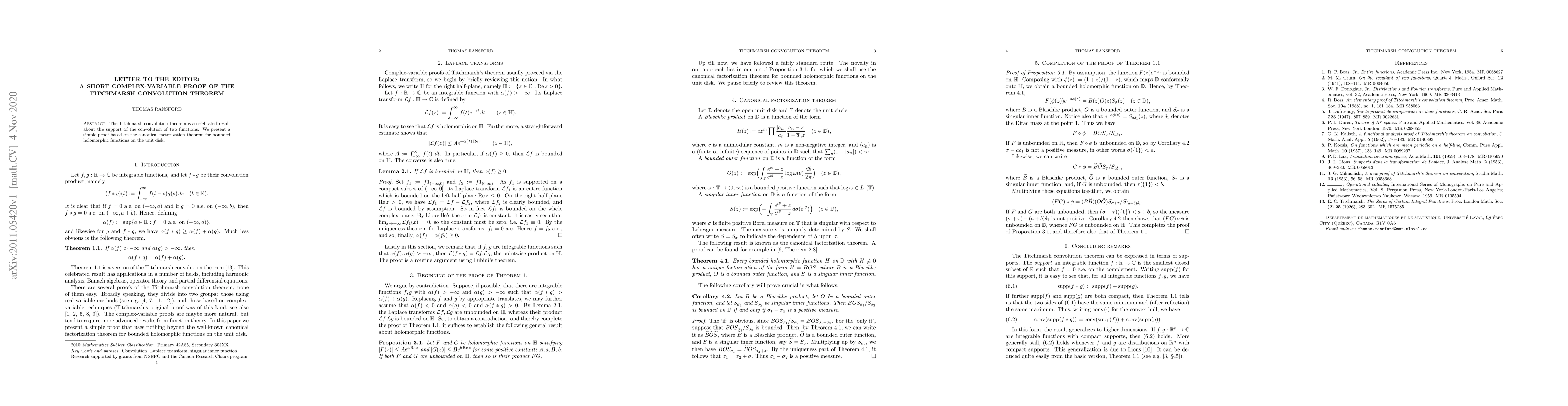 Summary: This letter provides a concise complex-variable proof of the Titchmarsh convolution theorem using the canonical factorization theorem for bounded holomorphic functions on the unit disk. The result concerns the support of the convolution of two functions.