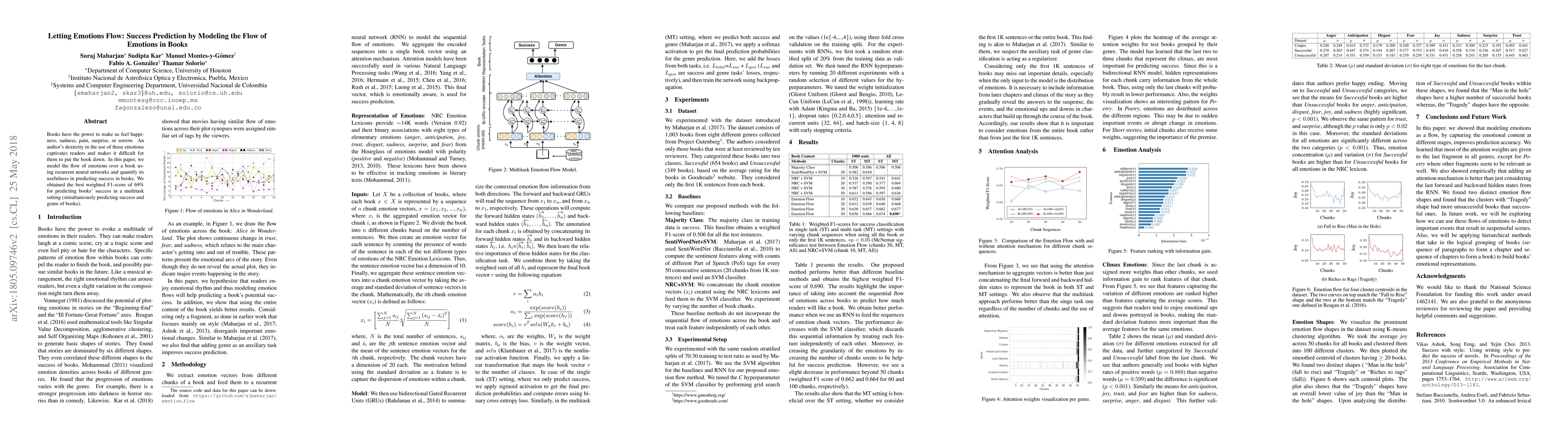 Books have the power to make us feel happiness, sadness, pain, surprise, or sorrow. An author's dexterity in the use of these emotions captivates readers and makes it difficult for them to put the book down. In this paper, we model the flow of emotions over a book using recurrent neural networks and quantify its usefulness in predicting success in books. We obtained the best weighted F1-score of 69% for predicting books' success in a multitask setting (simultaneously predicting success and genre of books).