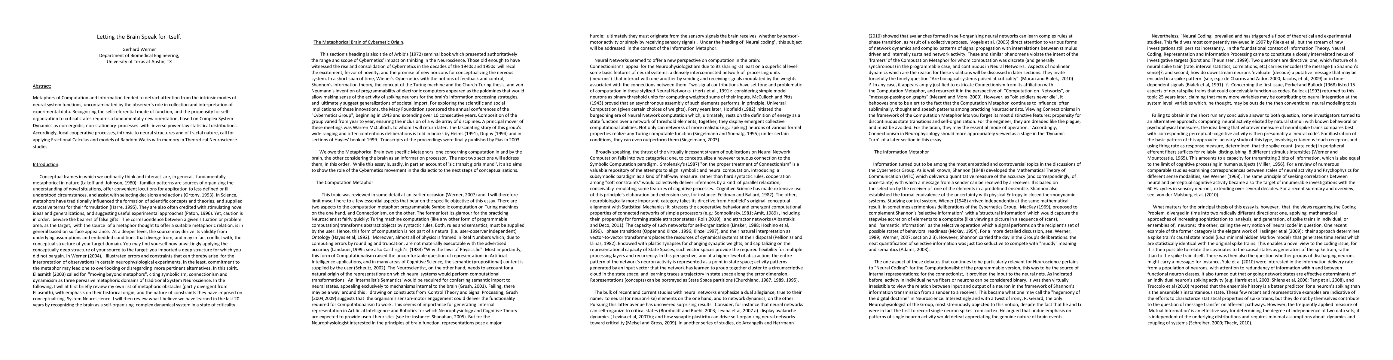Metaphors of Computation and Information tended to detract attention from the intrinsic modes of neural system functions, uncontaminated by the observer's role for collection and interpretation of experimental data. Recognizing the self-referential mode of function, and the propensity for self-organization to critical states requires a fundamental re-orientation with emphasis on the conceptual approaches of Complex System Dynamics. Accordingly, local cooperative processes, intrinsic to neural structures and of fractal nature, call for applying Fractional Calculus and models of Random Walks in Theoretical Neuroscience studies.