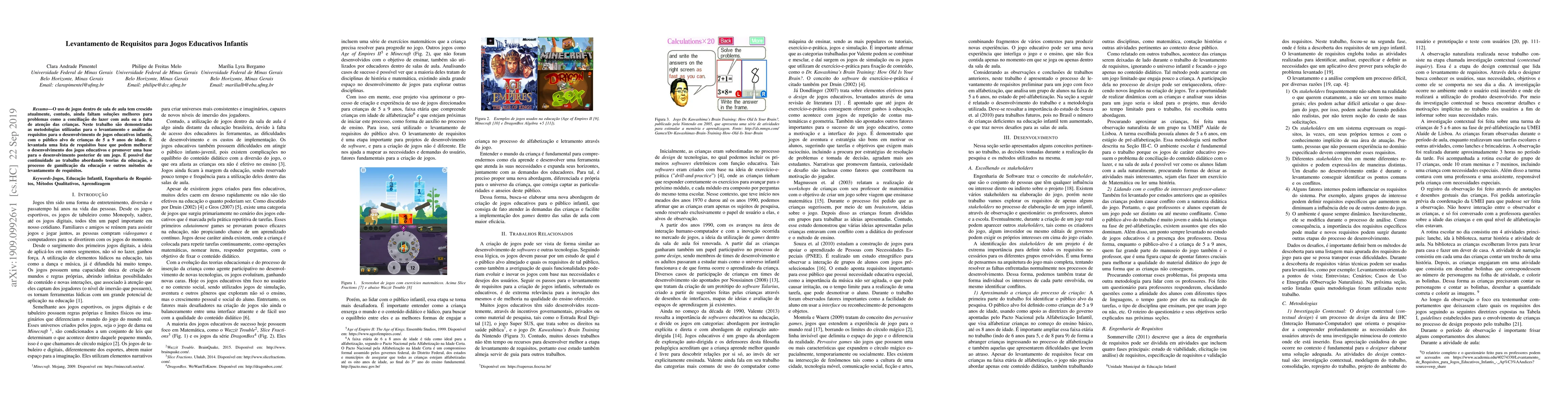 The use of games within the classroom is in constant growing, however, there are still demands for better solutions to problems such as reconciling leisure with class or the lack of attention of children. This work demonstrates methodologies used to survey and analyze requirements for the development of children's educational games, with the target audience of children from 5 to 9 years old. A list of basic requirements that can improve the development of educational games and provide a basis for further development of a game is raised. It is possible to continue the work by addressing theories of education, the process of gamification of education and other requirements gathering methods.