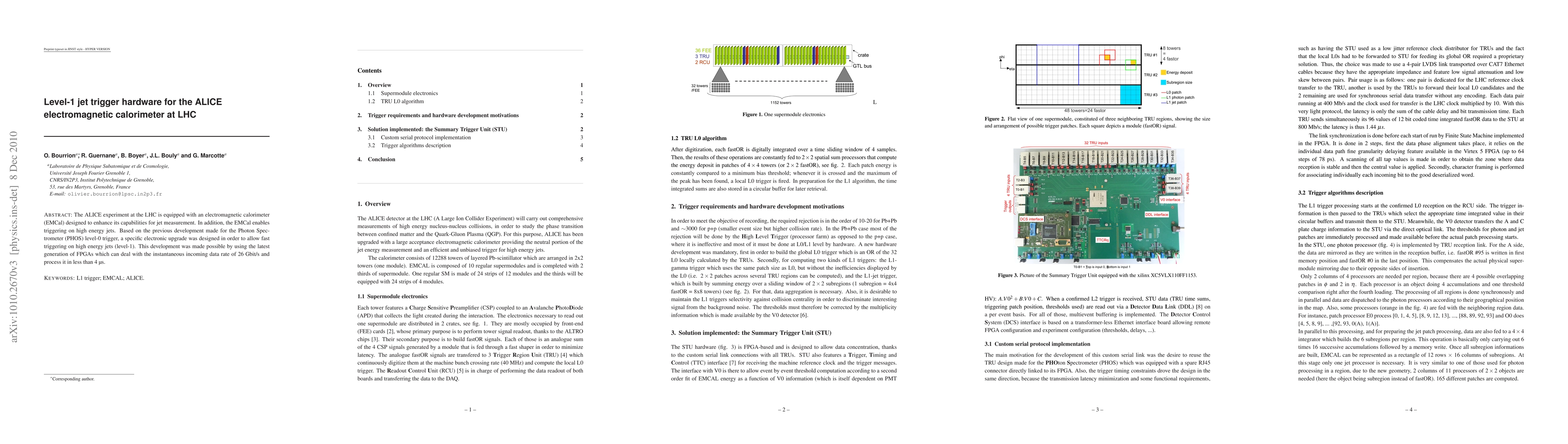 The ALICE experiment at the LHC has developed a level-1 jet trigger hardware for its electromagnetic calorimeter (EMCal) to enhance jet measurement capabilities. This upgrade, based on previous PHOS level-0 trigger developments, utilizes advanced FPGAs to handle 26 Gbit/s data rates and process them within 4 μs.