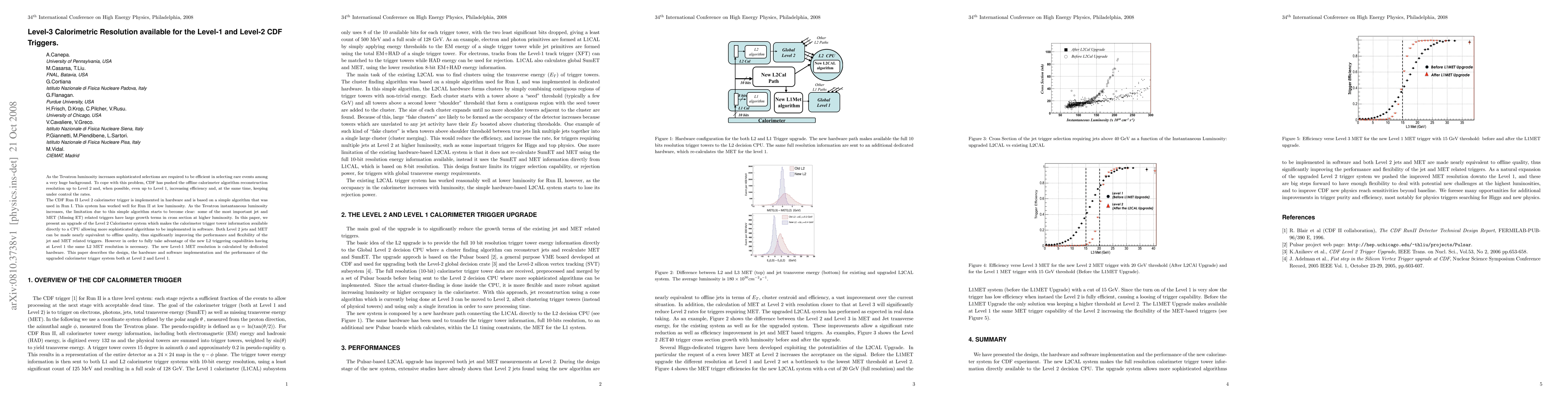 As the Tevatron luminosity increases sophisticated selections are required to be efficient in selecting rare events among a very huge background. To cope with this problem, CDF has pushed the offline calorimeter algorithm reconstruction resolution up to Level 2 and, when possible, even up to Level 1, increasing efficiency and, at the same time, keeping under control the rates. The CDF Run II Level 2 calorimeter trigger is implemented in hardware and is based on a simple algorithm that was used in Run I. This system has worked well for Run II at low luminosity. As the Tevatron instantaneous luminosity increases, the limitation due to this simple algorithm starts to become clear: some of the most important jet and MET (Missing ET) related triggers have large growth terms in cross section at higher luminosity. In this paper, we present an upgrade of the Level 2 Calorimeter system which makes the calorimeter trigger tower information available directly to a CPU allowing more sophisticated algorithms to be implemented in software. Both Level 2 jets and MET can be made nearly equivalent to offline quality, thus significantly improving the performance and flexibility of the jet and MET related triggers. However in order to fully take advantage of the new L2 triggering capabilities having at Level 1 the same L2 MET resolution is necessary. The new Level-1 MET resolution is calculated by dedicated hardware. This paper describes the design, the hardware and software implementation and the performance of the upgraded calorimeter trigger system both at Level 2 and Level 1.