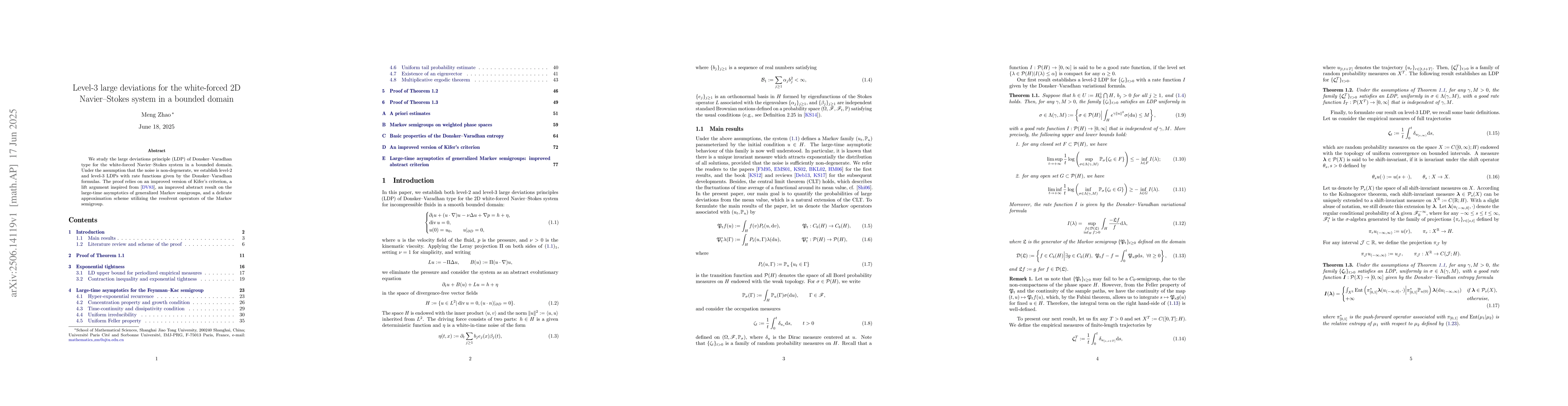 We study the large deviations principle (LDP) of Donsker-Varadhan type for the white-forced Navier-Stokes system in a bounded domain. Under the assumption that the noise is non-degenerate, we establish level-2 and level-3 LDPs with rate functions given by the Donsker-Varadhan formulas. The proof relies on an improved version of Kifer's criterion, a lift argument inspired from [DV83], an improved abstract result on the large-time asymptotics of generalized Markov semigroups, and a delicate approximation scheme utilizing the resolvent operators of the Markov semigroup.