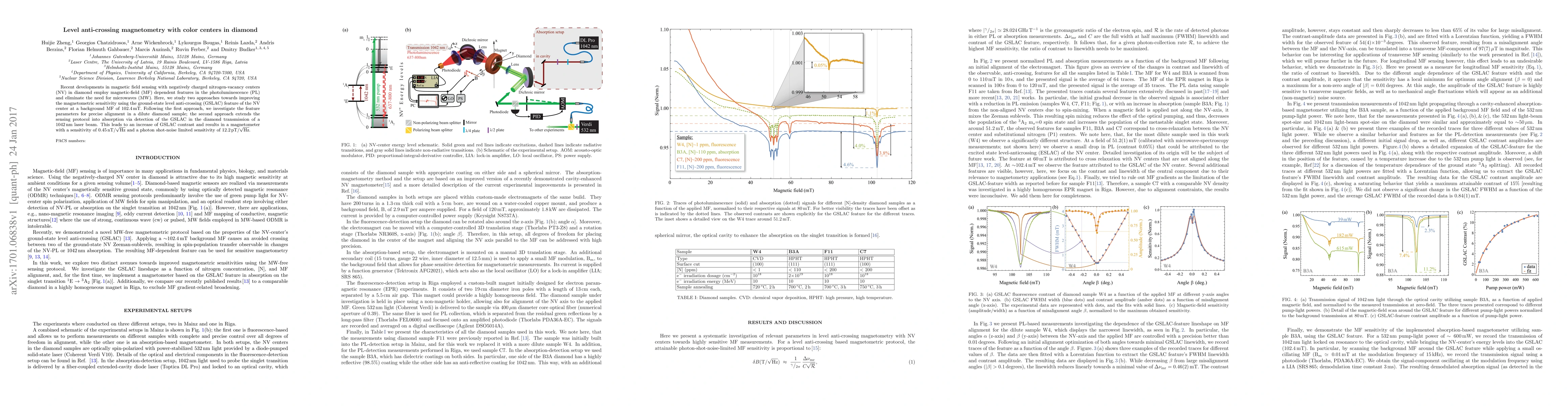 Recent developments in magnetic field sensing with negatively charged nitrogen-vacancy centers (NV) in diamond employ magnetic-field (MF) dependent features in the photoluminescence (PL) and eliminate the need for microwaves (MW). Here, we study two approaches towards improving the magnetometric sensitivity using the ground-state level anti-crossing (GSLAC) feature of the NV center at a background MF of 102.4\,mT. Following the first approach, we investigate the feature parameters for precise alignment in a dilute diamond sample; the second approach extends the sensing protocol into absorption via detection of the GSLAC in the diamond transmission of a 1042\,nm laser beam. This leads to an increase of GSLAC contrast and results in a magnetometer with a sensitivity of 0.45\,nT/$\sqrt{\text{Hz}}$ and a photon shot-noise limited sensitivity of 12.2 pT/$\sqrt{\rm{Hz}}$.