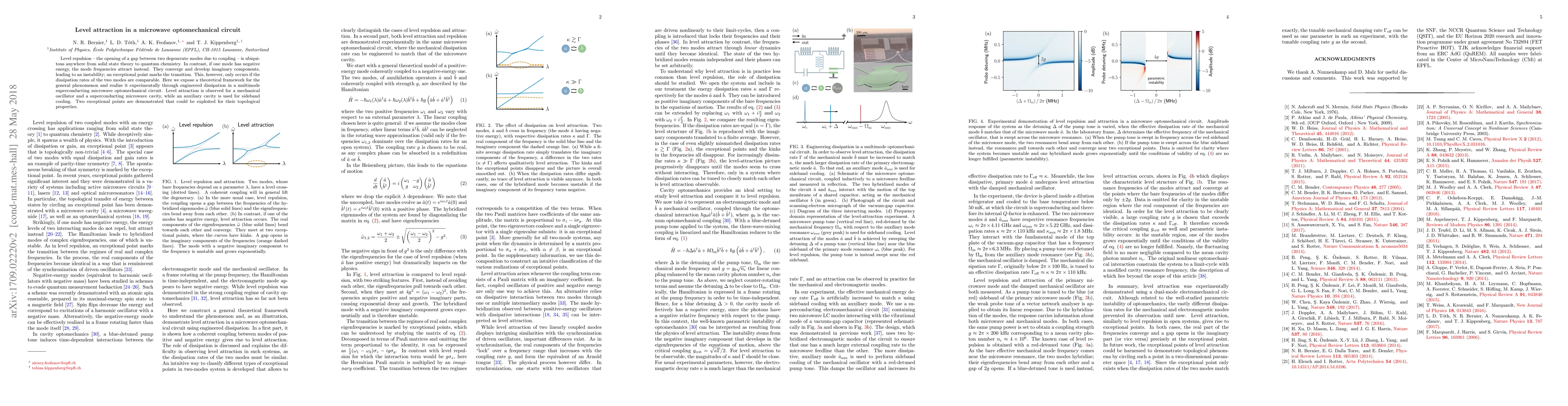 Level repulsion - the opening of a gap between two degenerate modes due to coupling - is ubiquitous anywhere from solid state theory to quantum chemistry. In contrast, if one mode has negative energy, the mode frequencies attract instead. They converge and develop imaginary components, leading to an instability; an exceptional point marks the transition. This, however, only occurs if the dissipation rates of the two modes are comparable. Here we expose a theoretical framework for the general phenomenon and realize it experimentally through engineered dissipation in a multimode superconducting microwave optomechanical circuit. Level attraction is observed for a mechanical oscillator and a superconducting microwave cavity, while an auxiliary cavity is used for sideband cooling. Two exceptional points are demonstrated that could be exploited for their topological properties.
