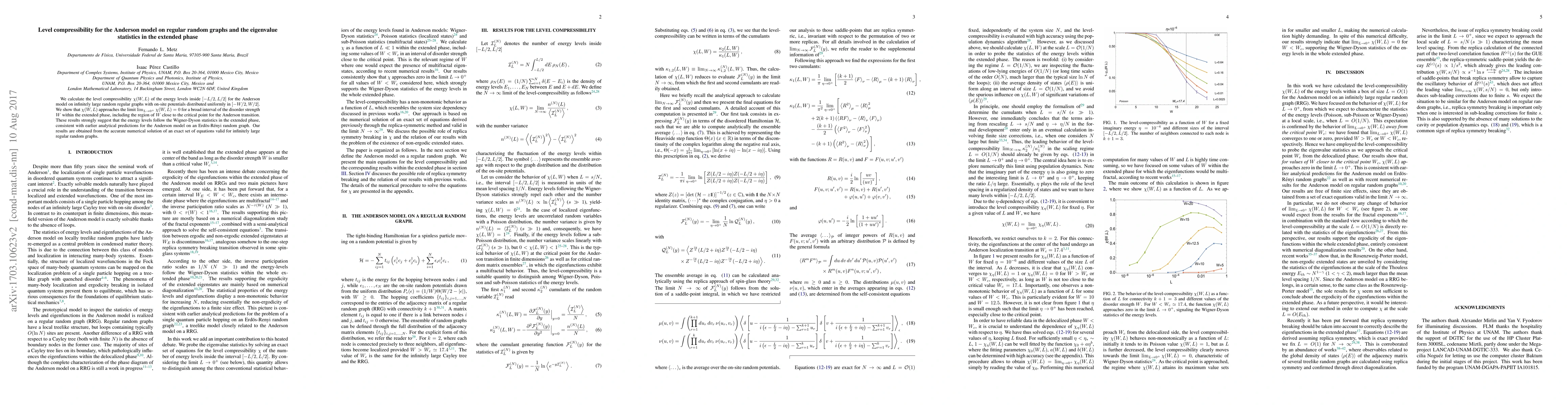 This paper calculates the level compressibility for the Anderson model on large random regular graphs, showing that it approaches zero in the extended phase, indicating Wigner-Dyson statistics for the energy levels, consistent with earlier predictions for random graphs. Numerical solutions confirm these findings.