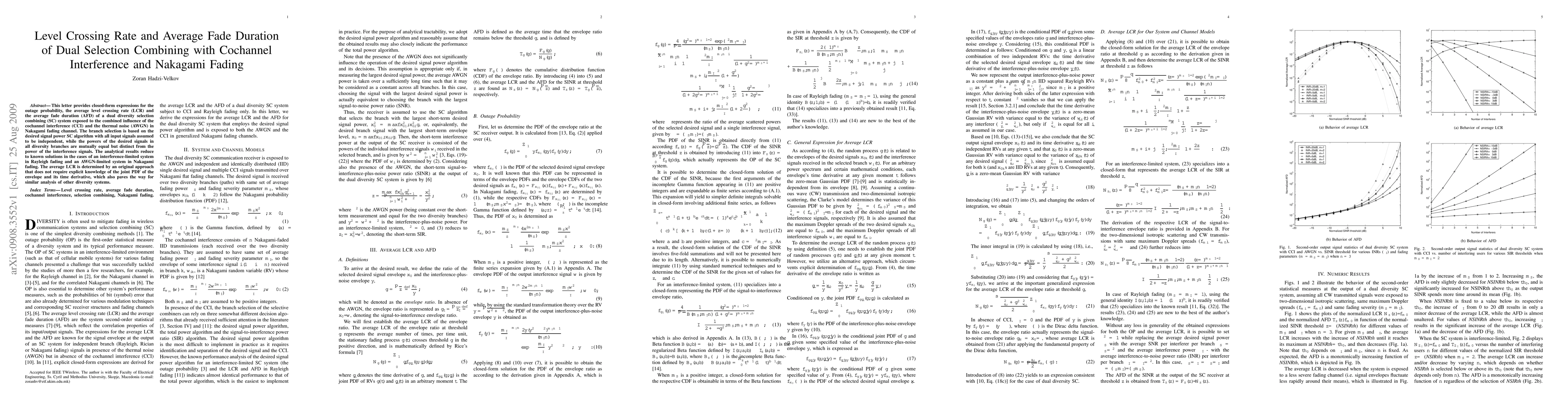 This paper derives closed-form expressions for outage probability, average level crossing rate, and average fade duration in a dual selection combining system under cochannel interference and Nakagami fading. The analytical results generalize to known solutions in simpler scenarios and introduce a novel method for determining average level crossing rate without requiring joint PDF knowledge.